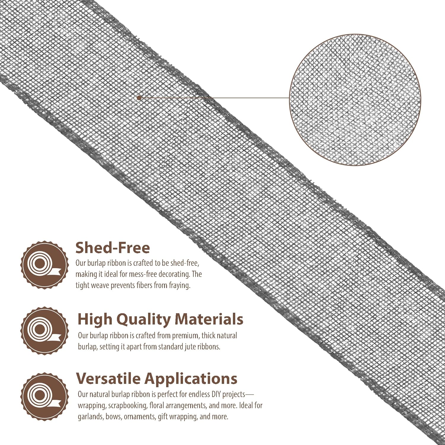 - Wired Burlap Ribbon: Compared to other jute burlap ribbons, our rustic burlaps ribbon with a fray & shed-resistant hemmed edges is made from thicker grey burlap fabric. The indoor & outdoor colored burlap crafts ribbon is colorfast and will not bleed.