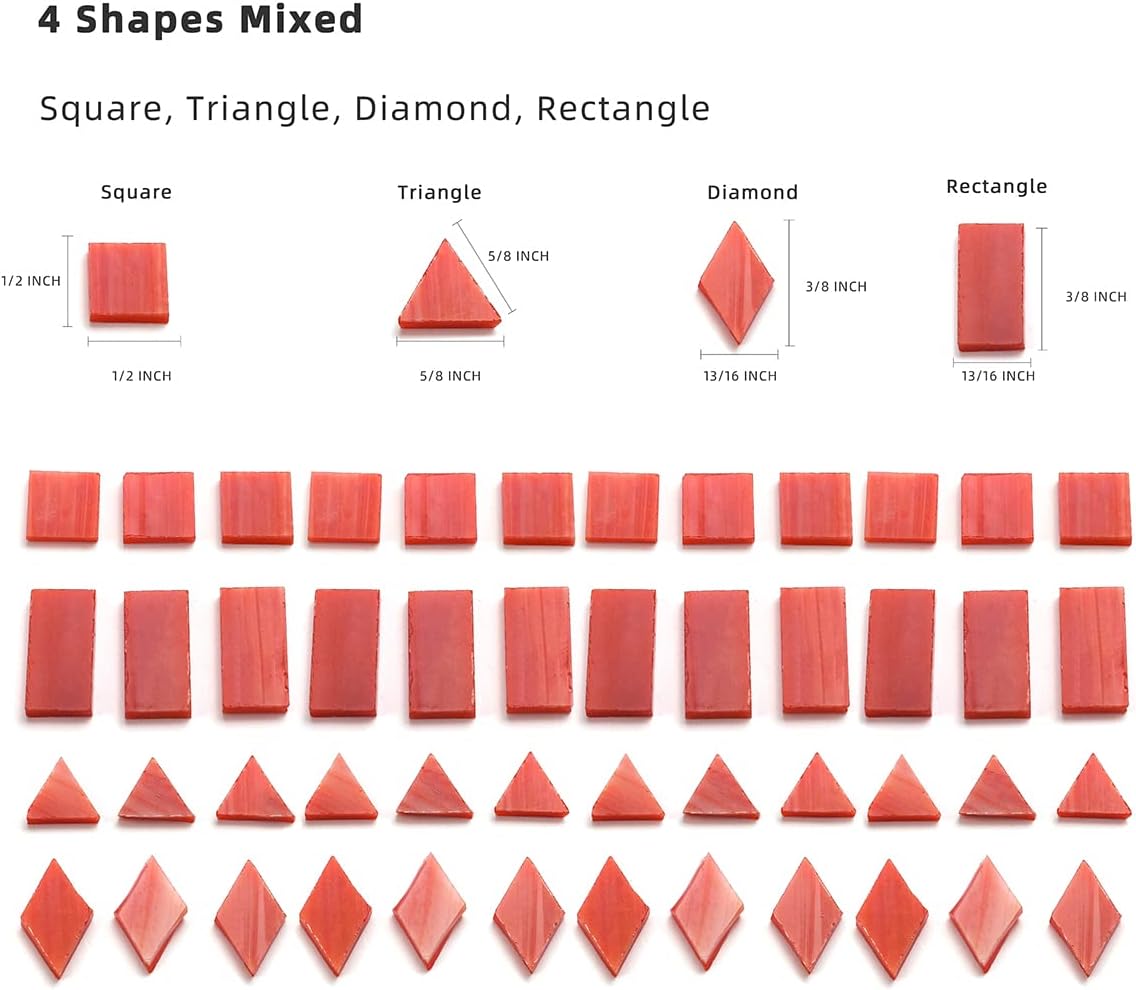 - 4 shapes mixed in each package - These mosaic pieces come with Square, Rectangle, Diamond and Triangle. Having all these precut beautiful shapes will not only save you a tremendous amount of time, but will also inspire you when trying to create new designs