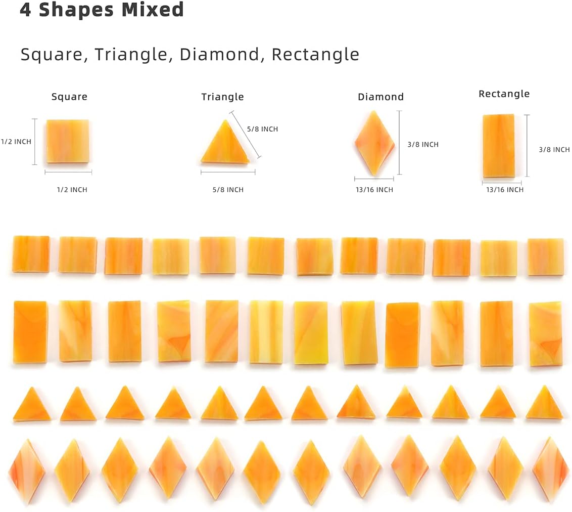 - 4 shapes mixed in each package - These mosaic pieces come with Square, Rectangle, Diamond and Triangle. Having all these precut beautiful shapes will not only save you a tremendous amount of time, but will also inspire you when trying to create new designs