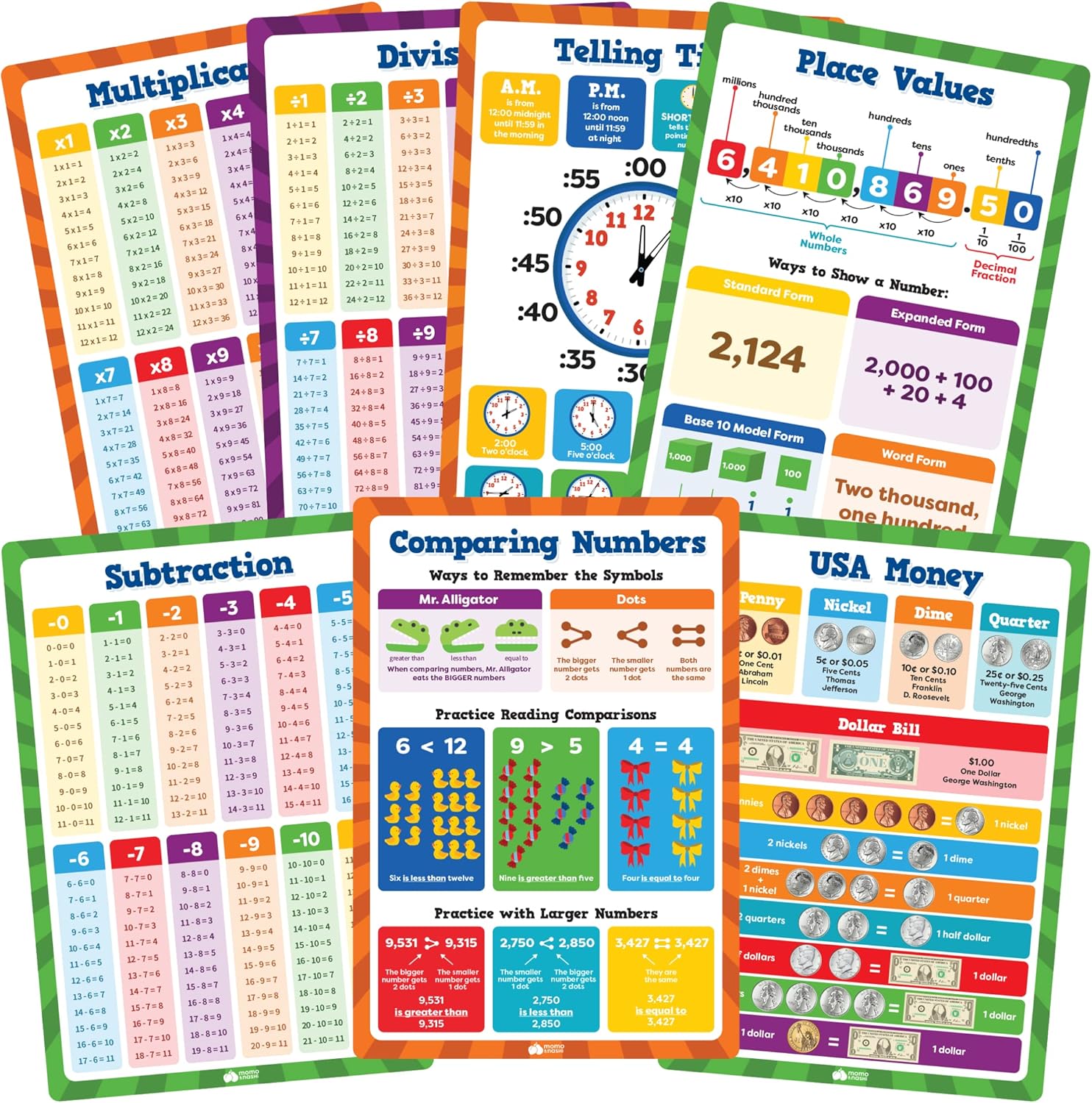 - Complete Your Classroom with Essential 13pc Math Posters Set. Each vibrant 16” x 11” educational tool includes a multiplication chart, times table chart, addition/subtraction/division tables, place value guides, telling time visuals, fractions, percentages, and more. Designed as math classroom must haves, it supports hands-on learning in elementary school classrooms, tutoring, and homeschool setups. Boost math mastery with engaging, real-world visuals.