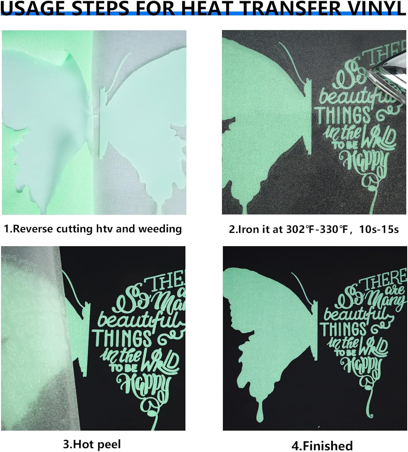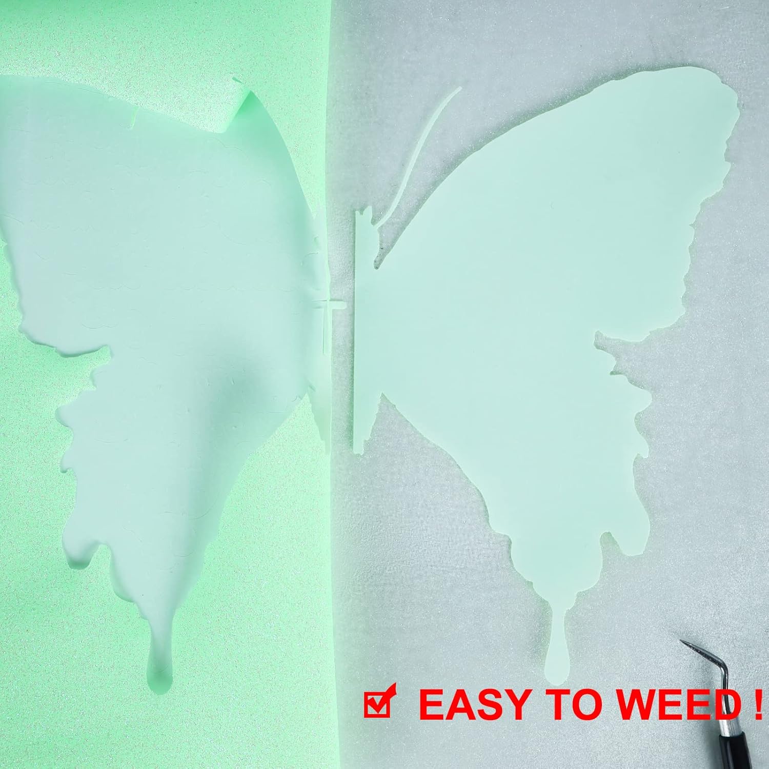 - EASY TO CUT & WEED & TRANSFER: Our luminous Light green glitter iron on vinyl rolls is sensitive to temperature and pressure, which can be quickly and easily to weed and peel. It is compatible with all cutter machines, most heat presses and household irons on the market, and perfect for 12x12" and 12x24" cutting mats. You can easily apply adhesive backing HTV to fabric using a hot iron or hot press. Please note that it is warm peel