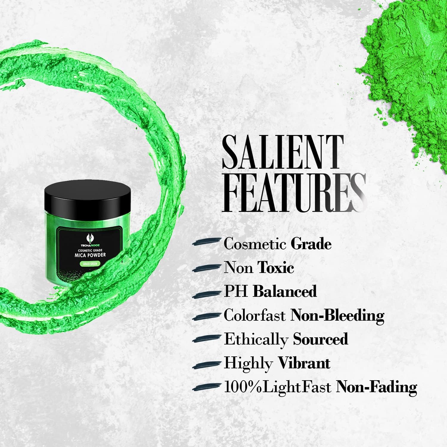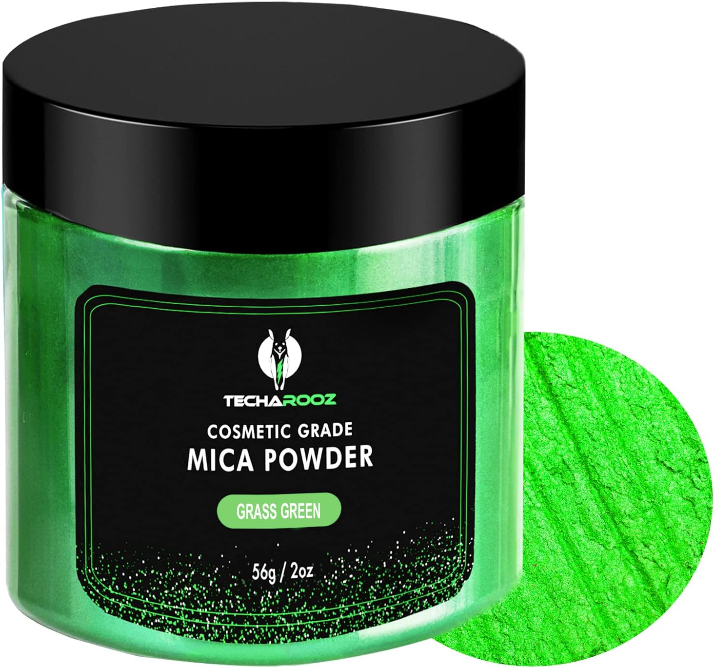 - Large Jar: Premium quality Grass Green mica powder in a large 56g/2oz jar. Perfect quantity and quality for craft projects of any size. This individually packed mica-based colorant is highly pigmented and will last a long time. Mix it with any other TECHAROOZ colors to create unlimited combinations of different hues