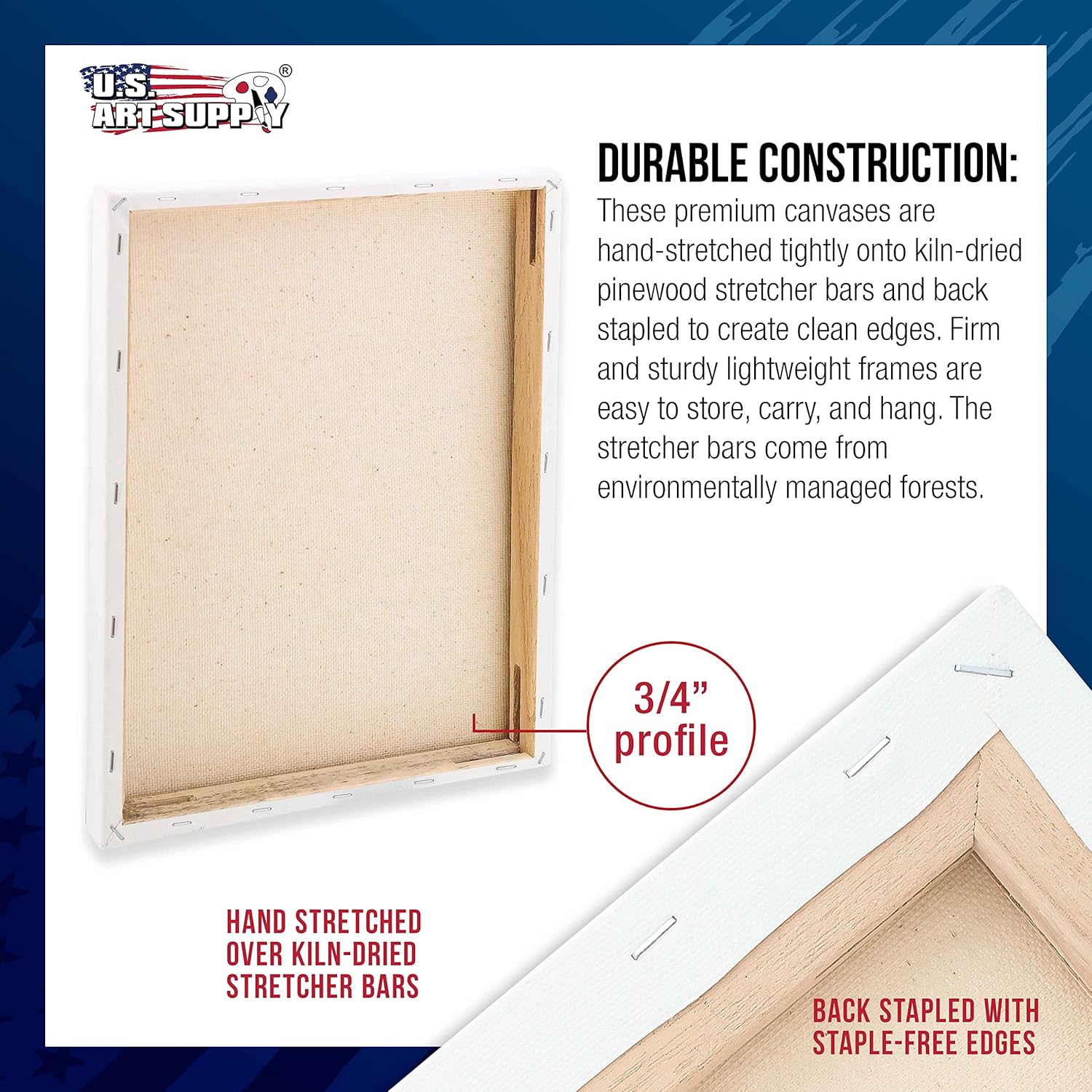 - Pack of 6 - Professional Artist Quality: 3/4" thickness profile 12-ounce triple primed stretched canvases that are suitable for all types of painting media and all skill levels of artists. Ideal for use with acrylic, oil, watercolor, gouache, tempura, pouring paint, airbrush paint, and other wet or dry painting media.