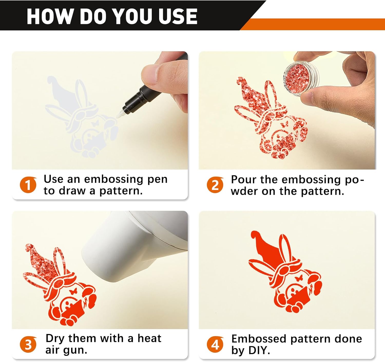 - Easy to use: the embossing pens are simple and convenient to apply, and compatible with your writing habits; You only need to draw your desired pictures, and add your choice of colorful embossing powders, bringing your creative ideas into reality
