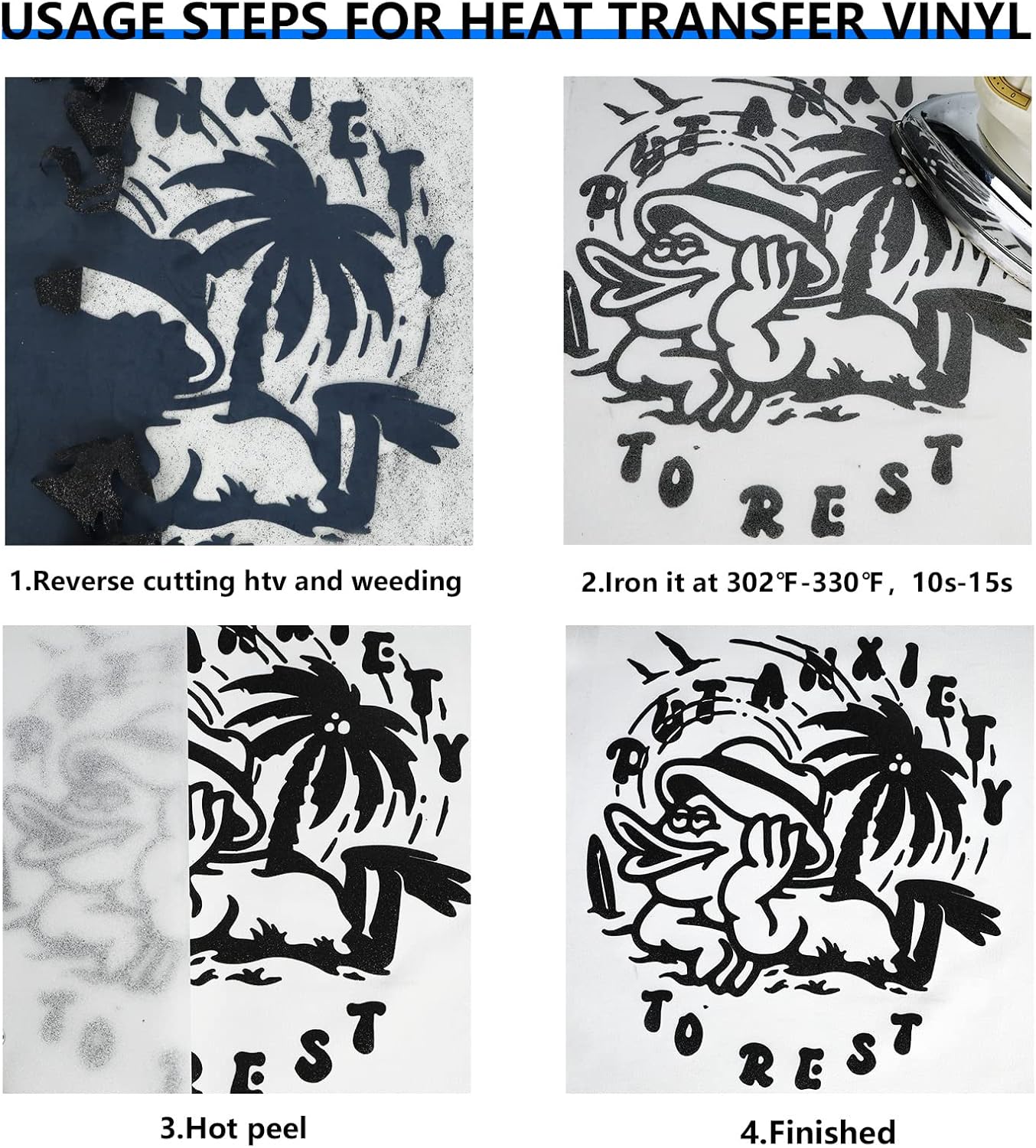 - EASY TO CUT & WEED & TRANSFER: Our black glitter HTV Vinyl rolls is sensitive to temperature and pressure, which can be quickly and easily to weed and peel. It is compatible with all cutter machines, most heat presses and household irons on the market, and perfect for 12x12" and 12x24" cutting mats. You can easily apply adhesive backing HTV to fabric using a hot iron or hot press. Please note that it is warm peel