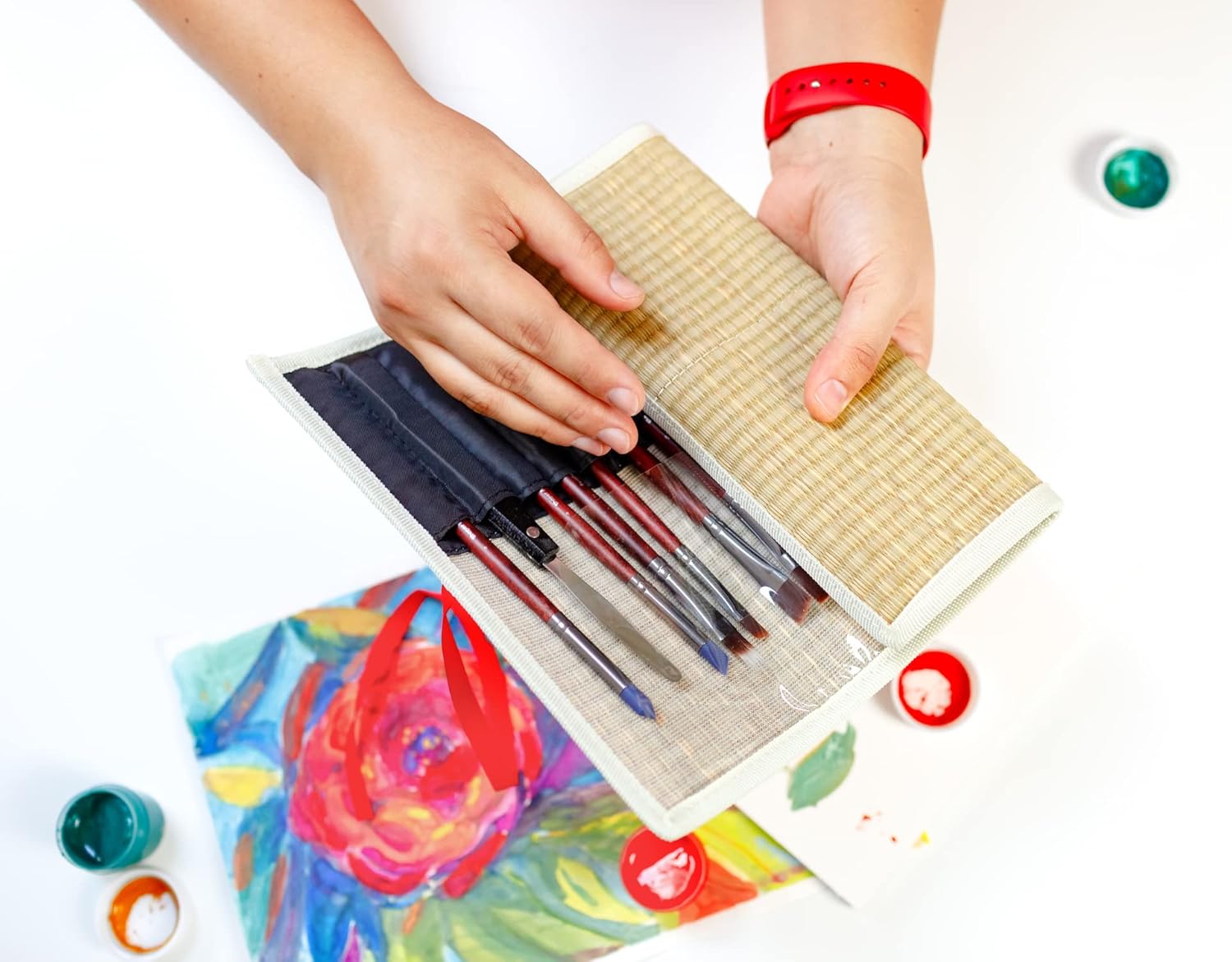 - NATURAL GRASS ROLL-UP CASE. This travel water color brush set comes in a unique woven grass roll-up case with PVC flap for keeping your bag mess-free after outdoor painting session. It's a great paint brush gift set with the light pleasant aroma of grass.