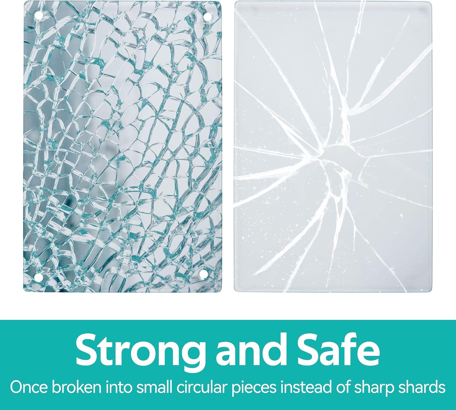 - Break-Resistant & Safe: Crafted from tempered glass for enhanced durability and safety. In the unlikely event of breakage, it shatters into small granules, not sharp shards, reducing the risk of injury. Rest assured, this cutting board is built to withstand everyday use. If you receive a damaged product, please contact us immediately, and we’ll send a replacement right away