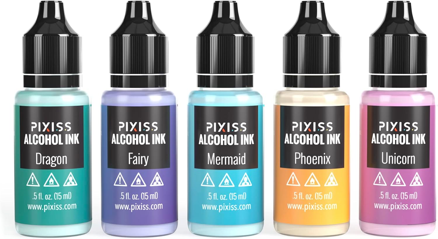 - What's Included - Pixiss offers 5 permanent, fast-drying individual alcohol inks, packaged in generous 15 ml bottles. Plenty to experiment with new shades, tones and unique alcohol ink techniques.