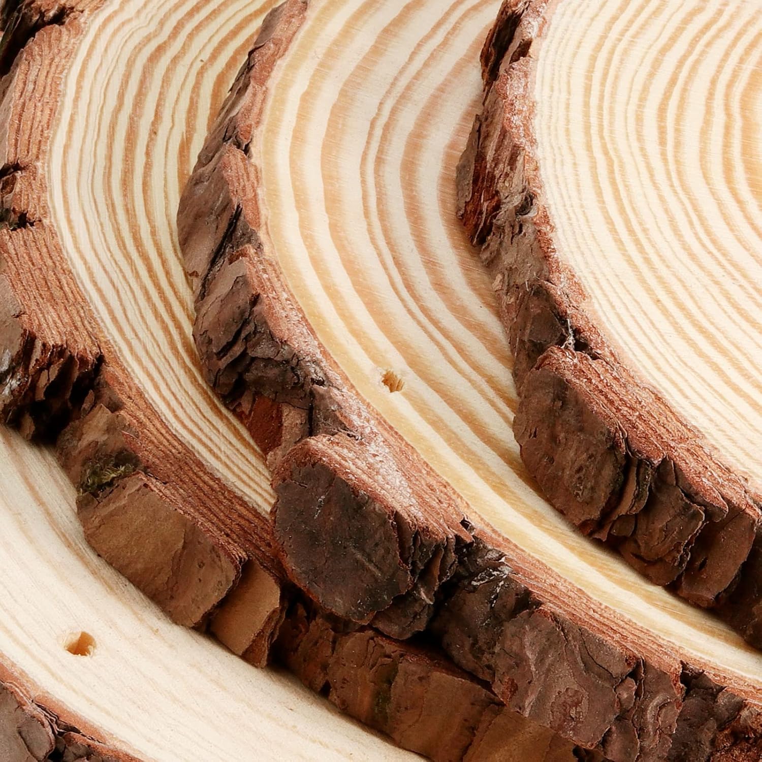 - NATURAL BEAUTY - These drilled wood slices made from natural pine are really nice. They smell, feel and look great. Decent sizes and fairly similar. They're big enough for simple or detailed designs. Not too thin or too thick. They all have beautiful wood grain patterns.