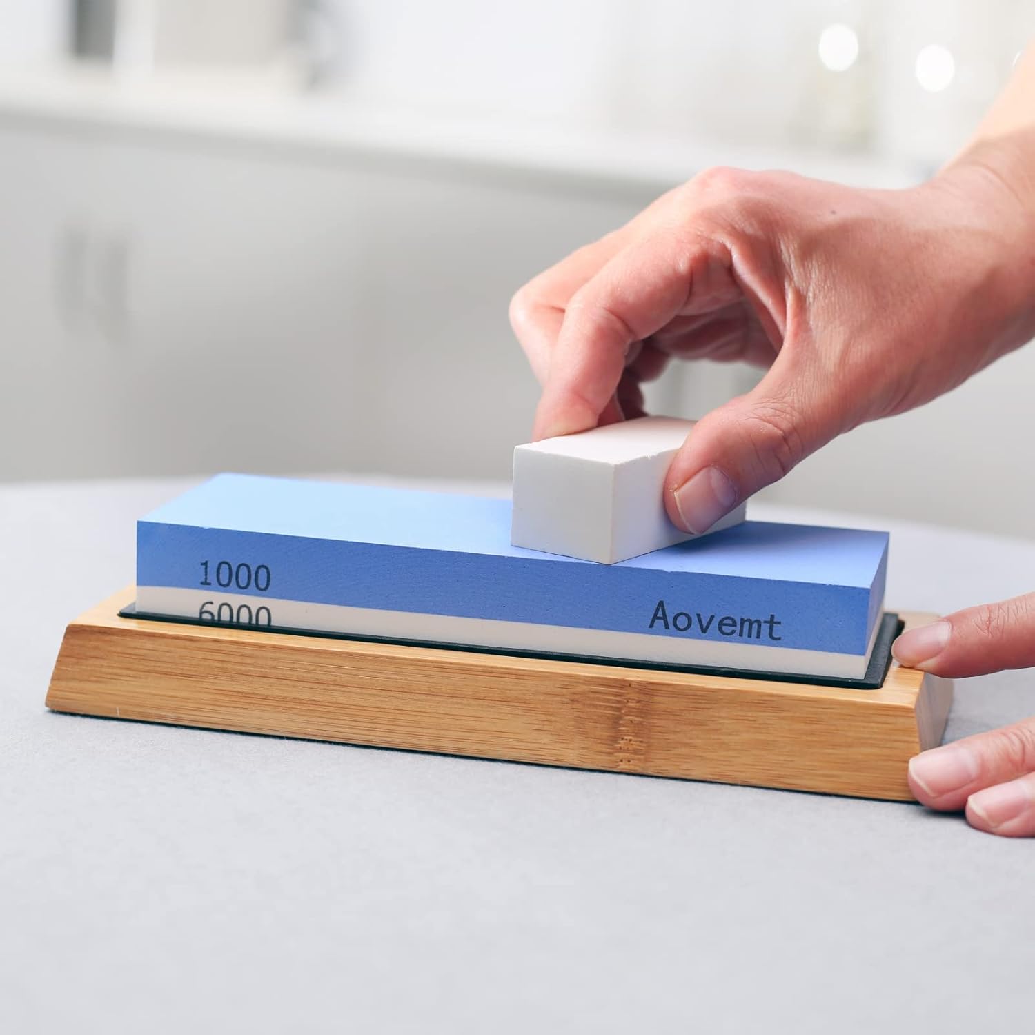 - 1. Double-sided Grit: The Aovemt sharpening stone features high-quality white corundum, which is double-sided pressed and fired as a single piece, ensuring it is not a low-quality dual independent whetstone that has been glued together. Its dual-sided grit of 1000/6000 makes it perfect for sharpening various kitchen knives, scissors, chisels, and other common blades.