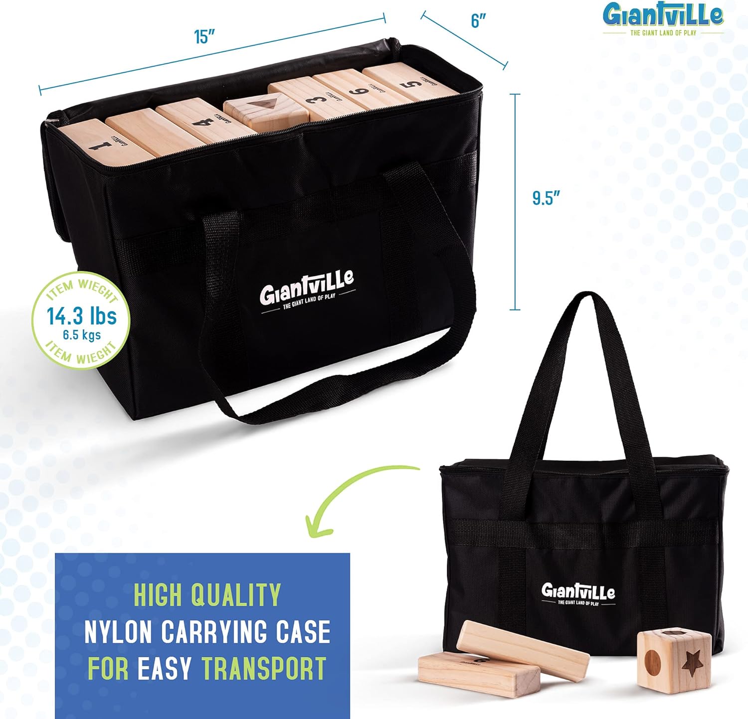 - HIGHEST QUALITY, DURABLE WOOD and CARRY/STORAGE BAG: Meticulously sourced, high-grade premium pine wood are sanded to a smooth finish and will withstand years of stacking and tumbling indoors or outdoors. The robust zippered nylon carrying bag fits the blocks perfectly. Just grab the rugged handles and you’re ready to be the talk of the next event. When you’re done, blocks stack neatly and discreetly in the carry bag, so you can stow it away neatly while you await the next opportunity to play.