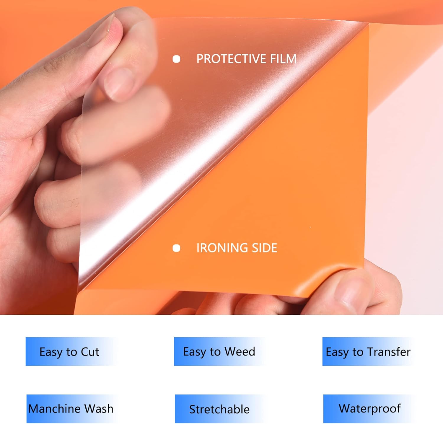 - Glossy heat transfer vinyl HTV: Our Orange htv iron on vinyl is made out of the highest quality polyurethane that is incredibly strong, durable and vibrant fine Using the special technology, the htv is thin and extremely durable and soft. The whole weeding process just like a breeze at the help of sticky back.