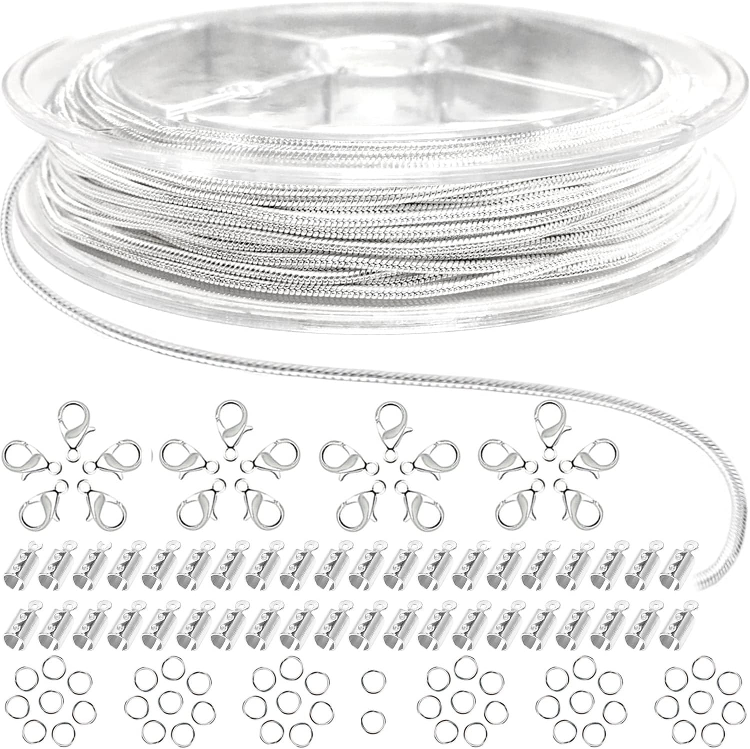 - 33 FEET ROLL SET: 33ft (10m) Silver plated copper snake chain spool - 20 Silver plated alloy lobster clasps - 50 Silver plated iron jump rings - 50 Silver plated iron fold over cord end caps crimp end tips.