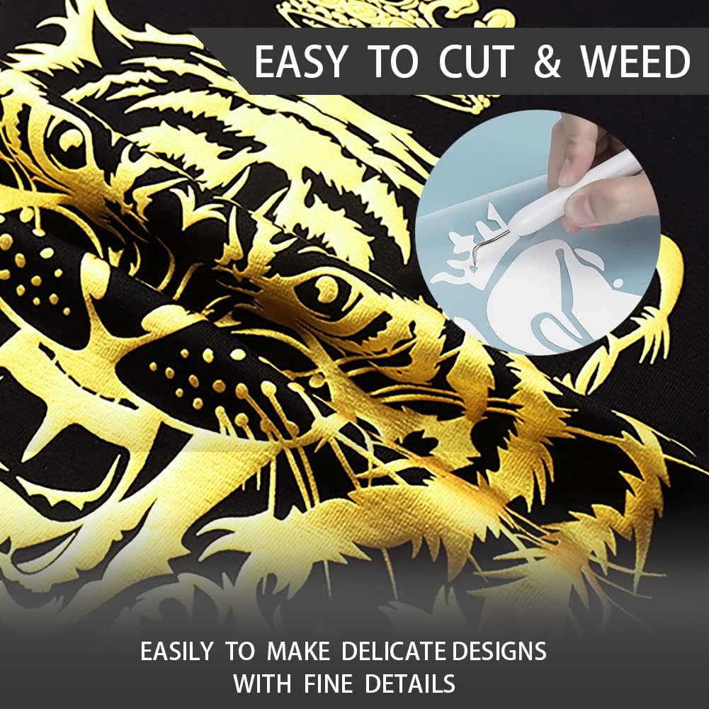 - The metallic gold foil htv vinyl with only 80ΞΌ thickness is sensitive to pressure and temperature, easy to cut, peel and heat press on your desired fabric surface. They adhere to the fabric seamlessly and has held up well in the wash without fading, peeling and crack, great for beginners!