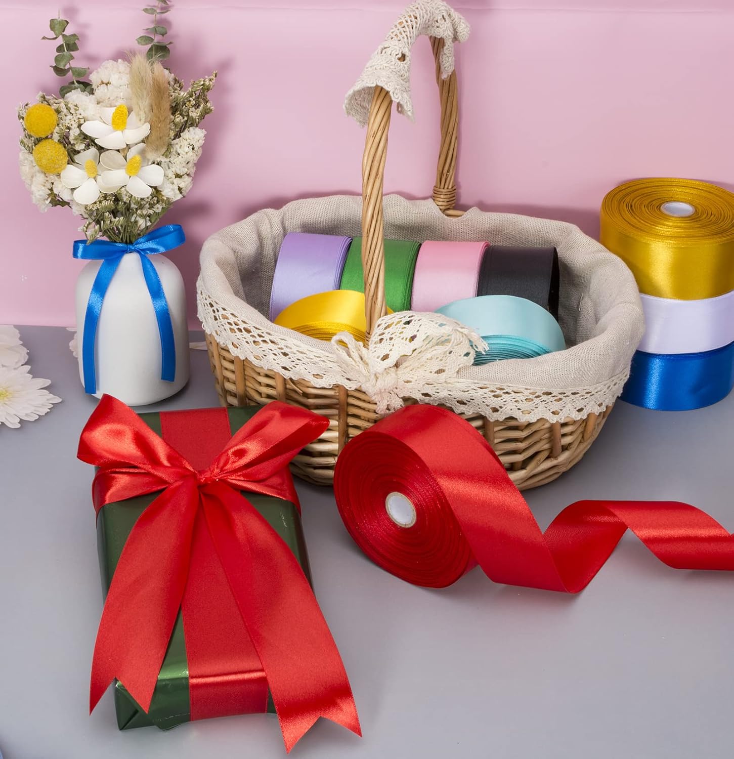 - Versatile ribbon, wide range of applications, especially for gift box packaging, invitations, floral design, handmade roses, festival and party decorations, baking packaging, bouquet ribbons, crafts, and more creative design