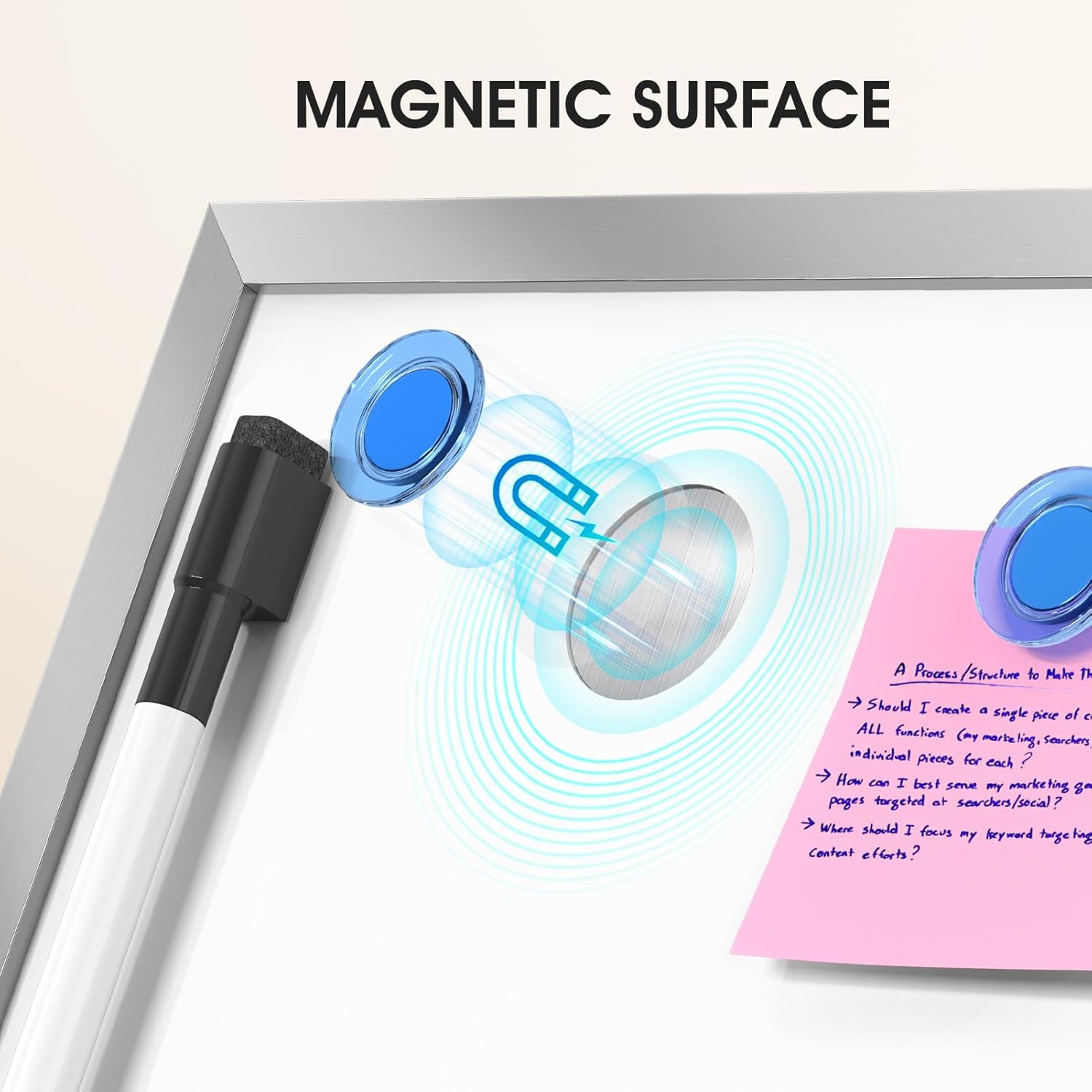 - Adjustable Design & Magnetic Surface: Designed with a smooth and magnetic writing surface, our dry erase board is easy to write on and clean. The included magnets adhere firmly to the surface, allowing you to attach papers easily. By adjusting the screws on one side, you can either hang the white board on the wall with the included nail or stand it on the desktop.