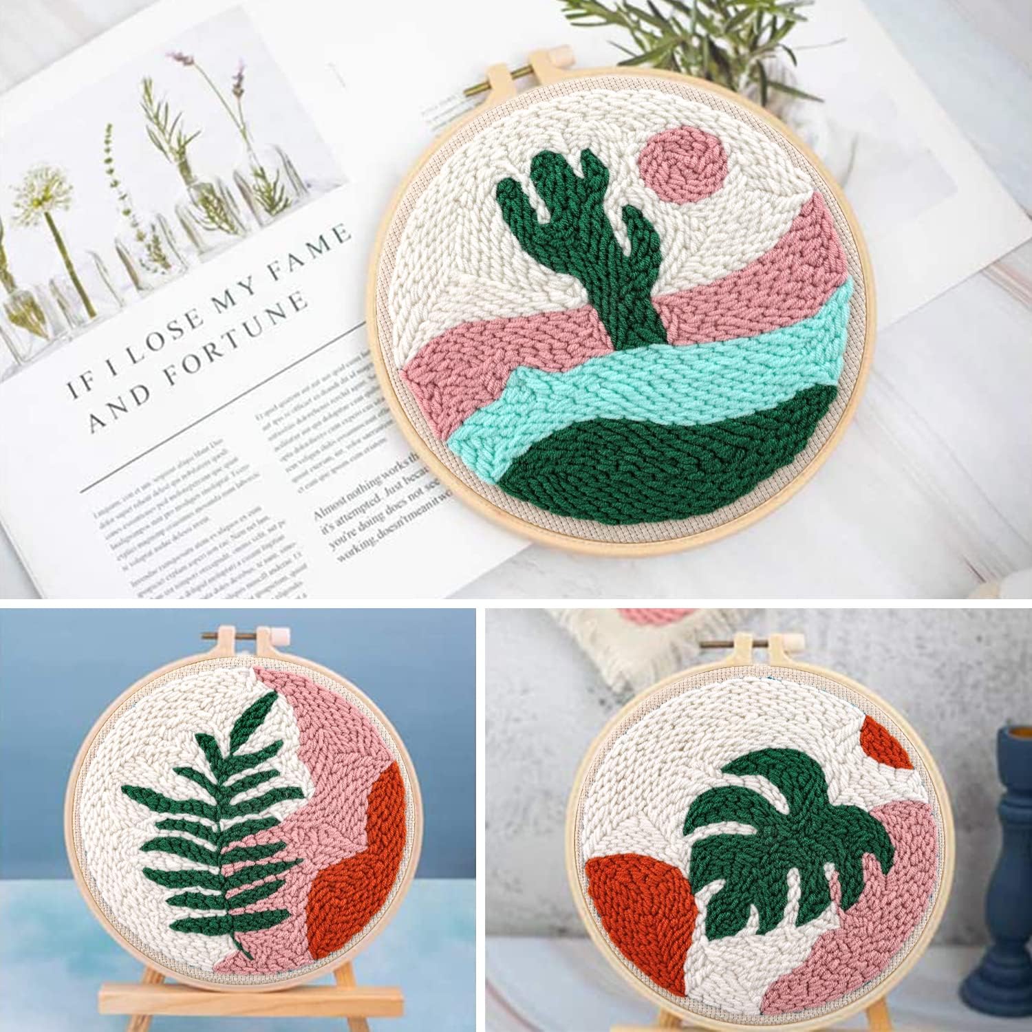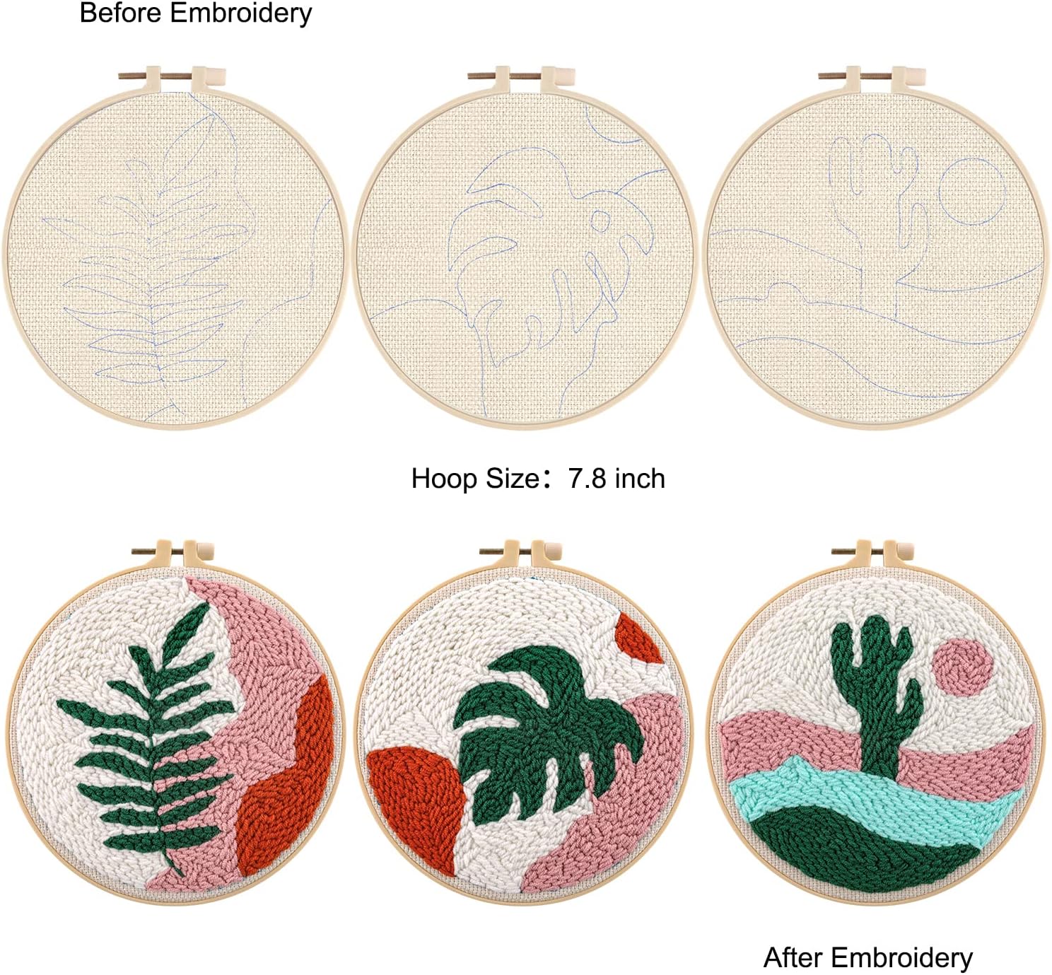 - [Punch Needle Kit] 3 x adjustable hoop(7.8 inch), 3 x punch needle fabric, 3 x instructions, 1 x punch needle, , 1 x scissor, 1 x needle-threading tool, and enough yarns.