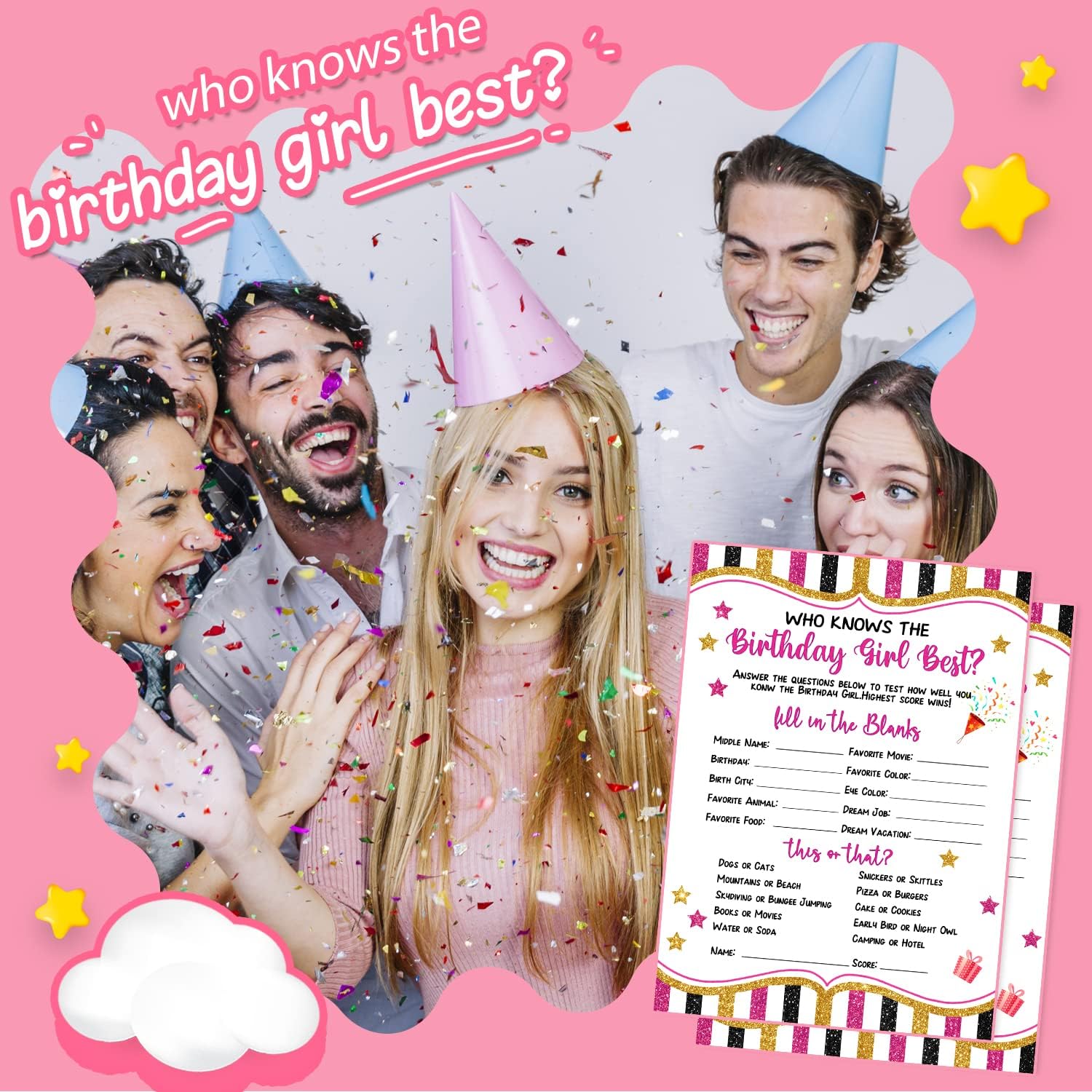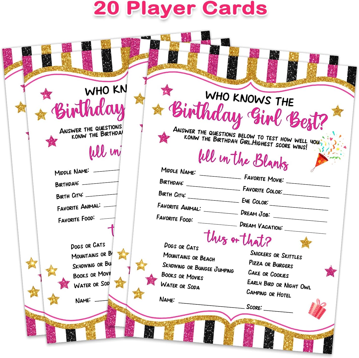 20 Pieces Who Knows The Birthday Girl Best Game Cards - Birthday Party Activity Game Card Set Girly Themed Party Activity and Idea - for Child or Teen - Girl Birthday Supplies, Activity, Decorations