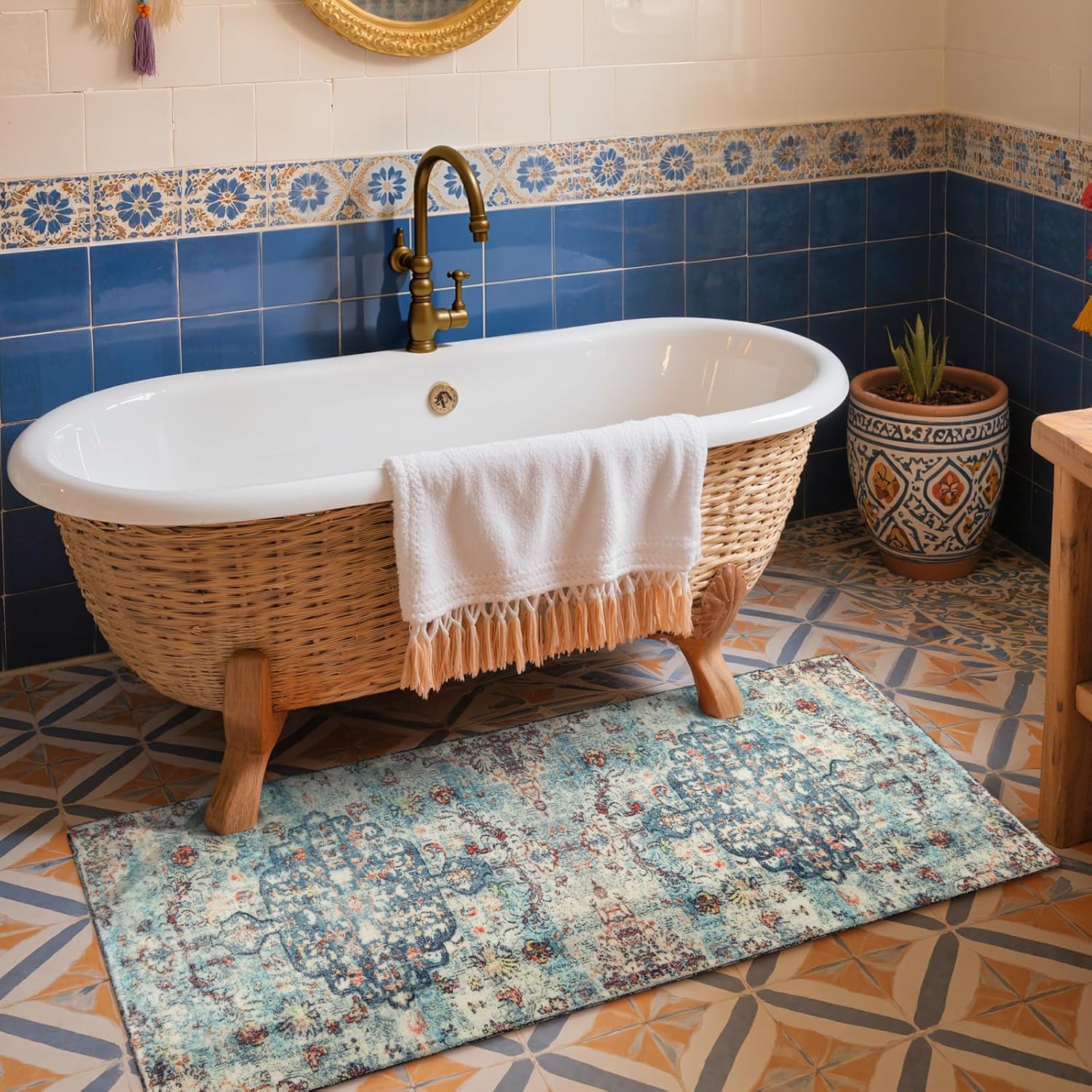 - [Exclusive Design Throw Rug] - The suitable way to brings a refreshing boost of color to your home, this bohemian floral medallion rug is a must-have for your home. It features a cream, vintage teal, and cute orange design floral patterns with purposeful distressing to add vintage appeal to your space.