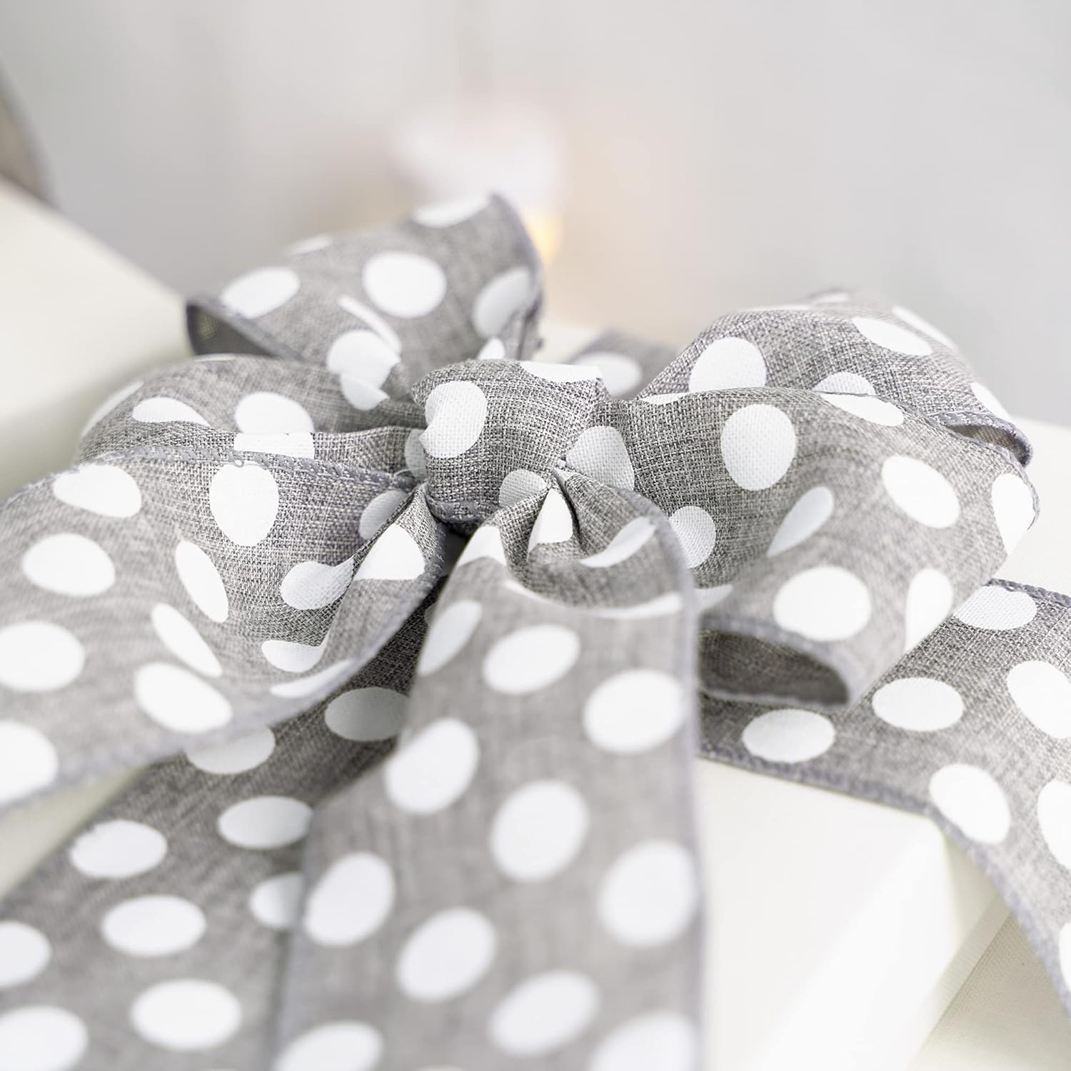 - Medium multi white polka dot ribbon on gray burlap ribbon, 2-1/2" wide and 10 yards long with solid grey edging. This ribbon is shipped on the spool and would be beautiful for all of your craft needs, great product for wreath makers!
