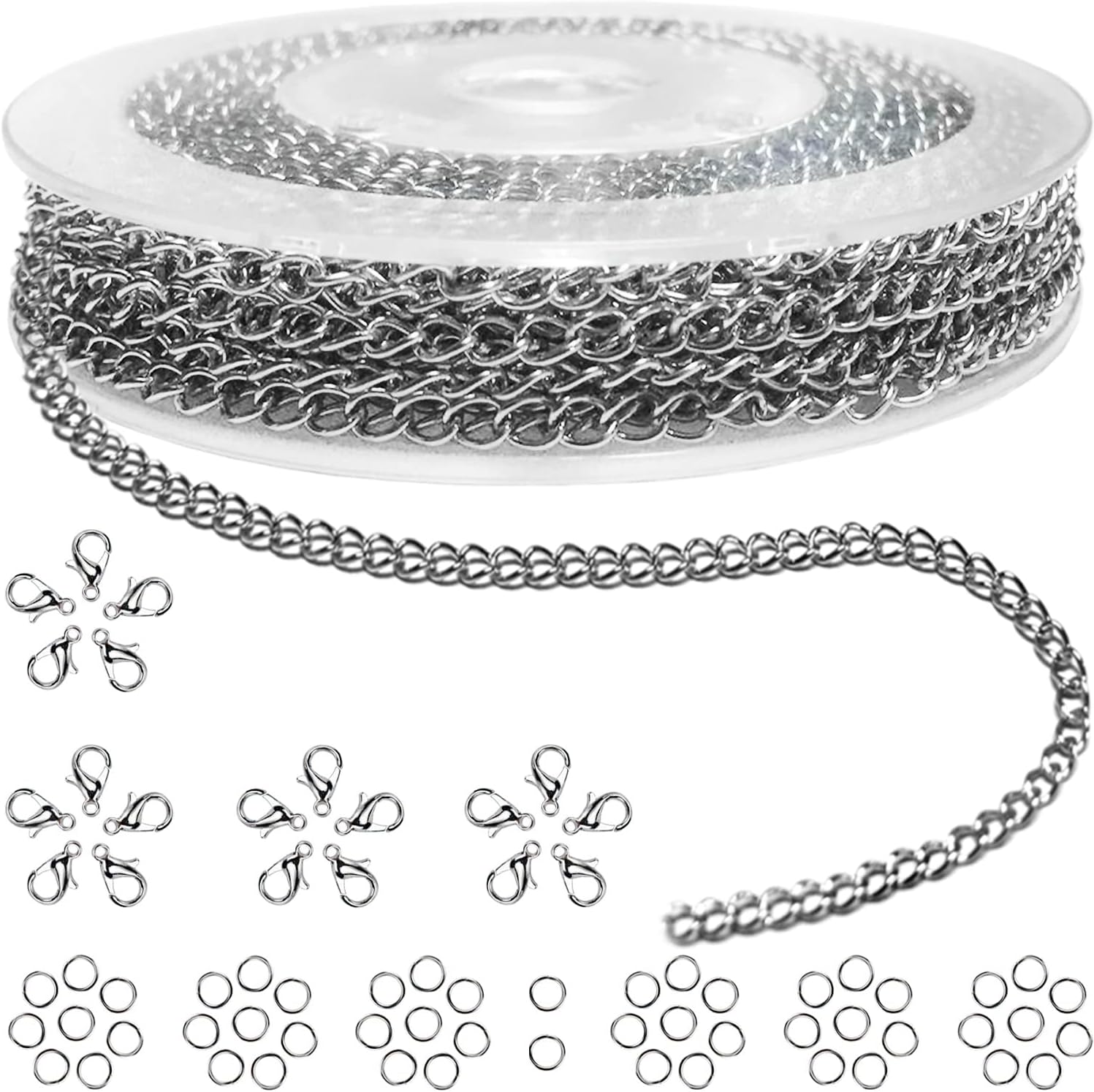 - 33 FEET ROLL SET: 33ft (10m) Silver Stainless Steel Curb Link Cable Chain Spool - 20 Silver Stainless Steel Lobster Clasps - 50 Silver Stainless Steel Jump Rings.