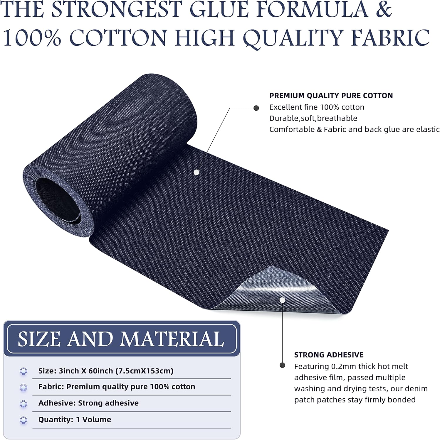 KING MOUNTAIN Iron-on Repair Patch,3"x60"100% Cotton Denim Iron-on Repair Patch, Jeans and Clothing Repair and Decoration Kit (Dark Blue)