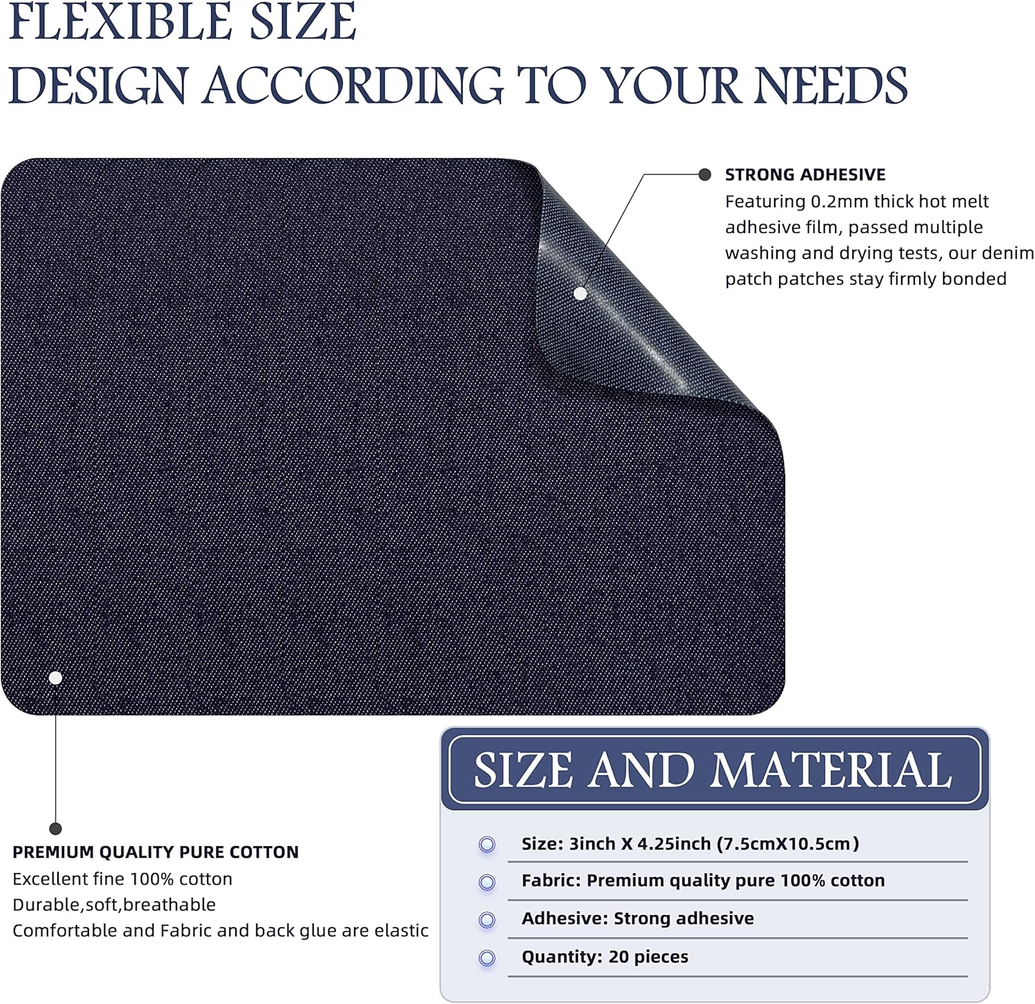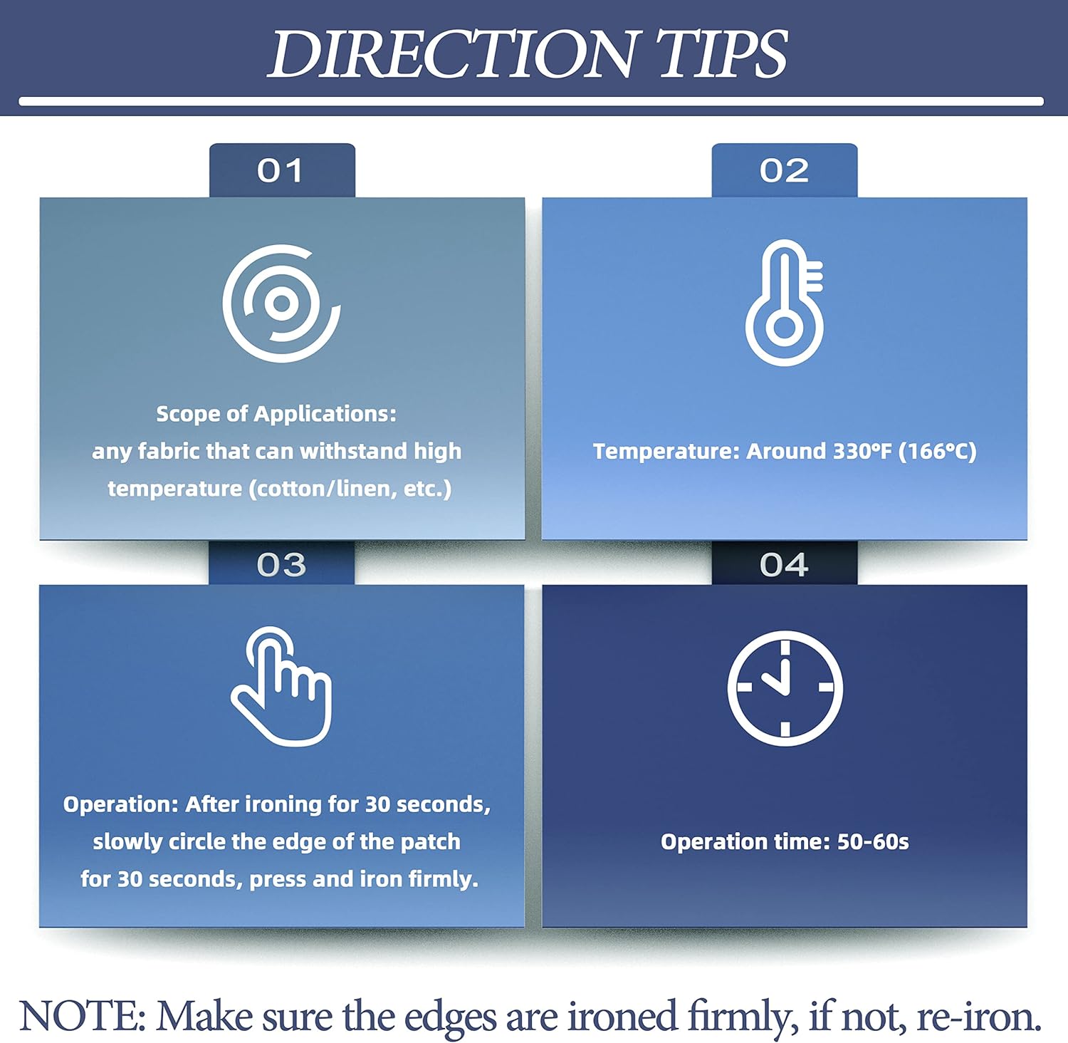 - Easier to Use: Our denim iron-on repair patches can repair or decorate your clothes in minutes, easy to apply in clothing repair, reinforcement, decoration. Open the package, remove the denim patch, stick it on the proper spot and iron at 330Β°F for one minute. (Can be used both inside and outside, no backing, no instructions for use)