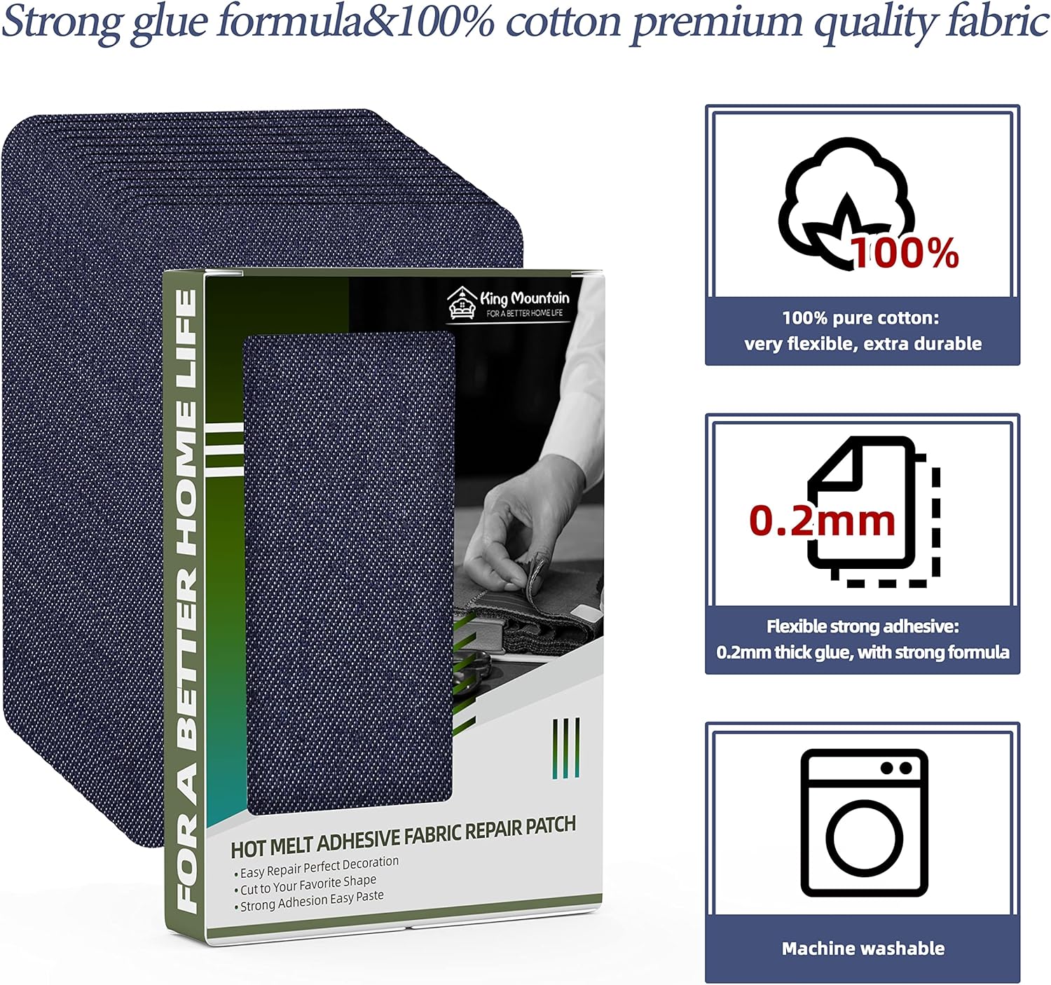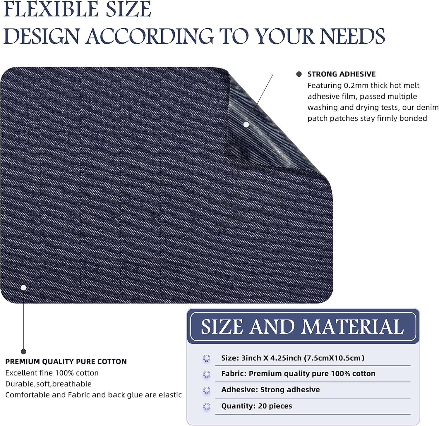 - Easier to Use: Our denim iron-on repair patches can repair or decorate your clothes in minutes, easy to apply in clothing repair, reinforcement, decoration. Open the package, remove the denim patch, stick it on the proper spot and iron at 330Β°F for one minute. (Can be used both inside and outside, no backing, no instructions for use)