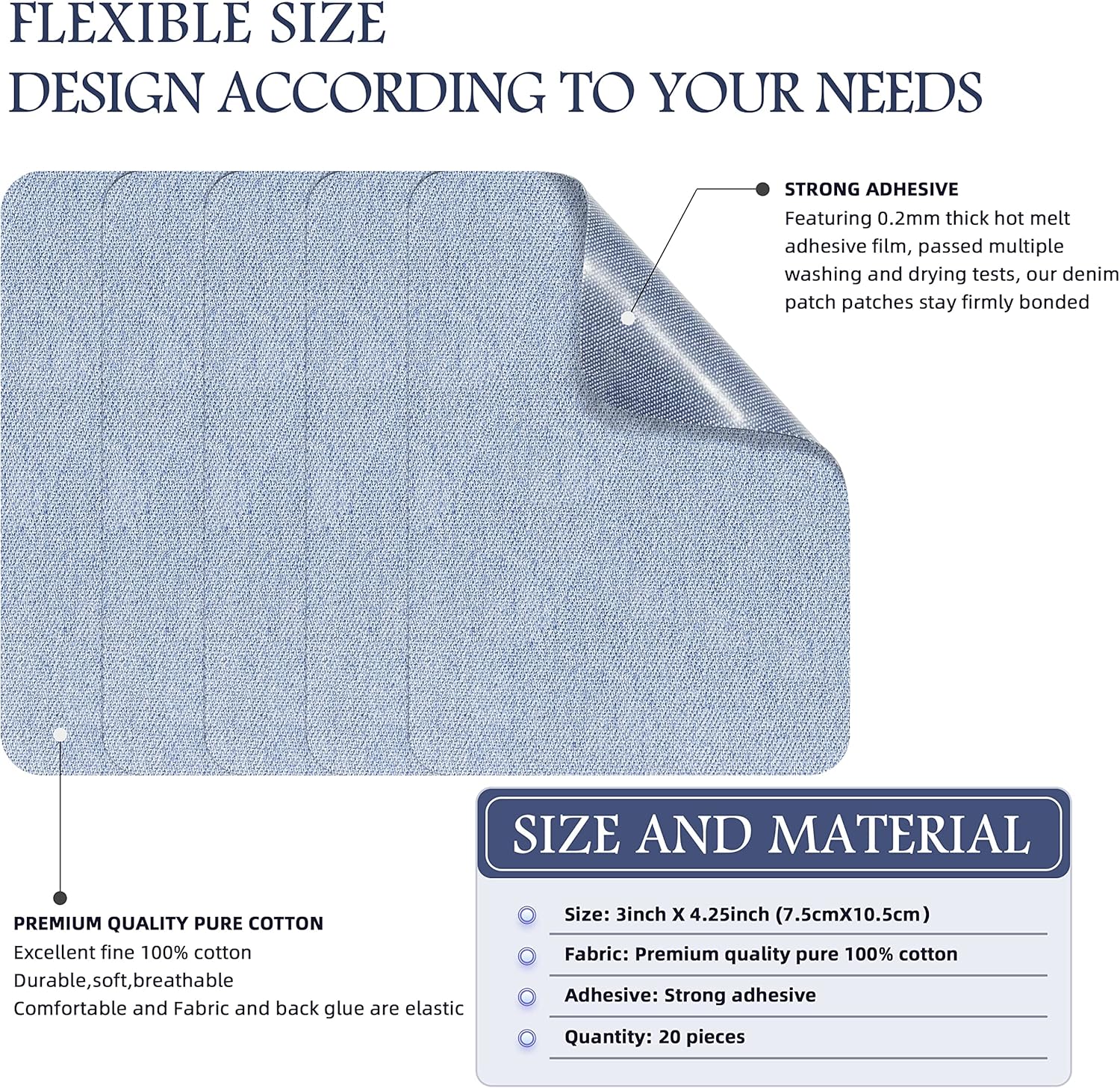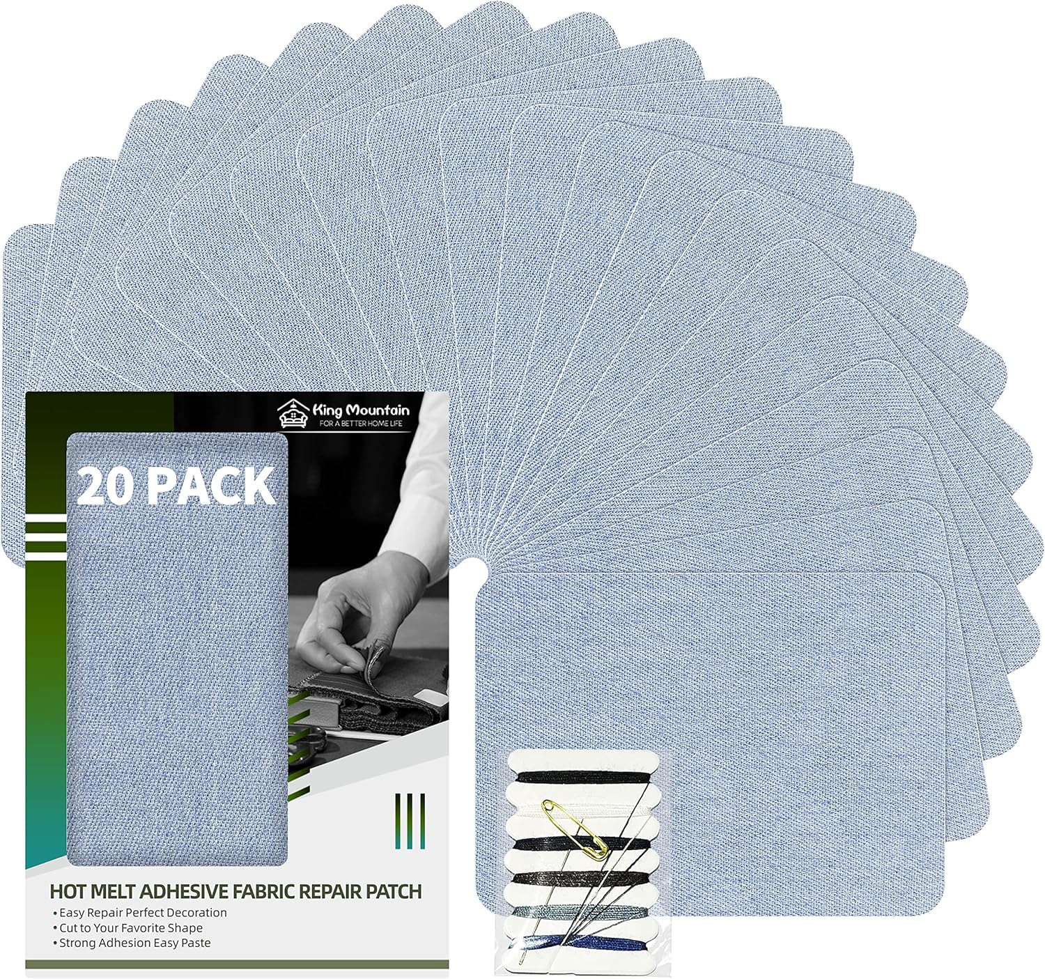KING MOUNTAIN Iron-on Repair Patch 20 Pcs Pack,Denim Patches for Jeans Kit 3" by 4-1/4",100% Cotton Denim Iron-on Repair Patch,Jeans and Clothing Repair and Decoration Kit (Light Blue)