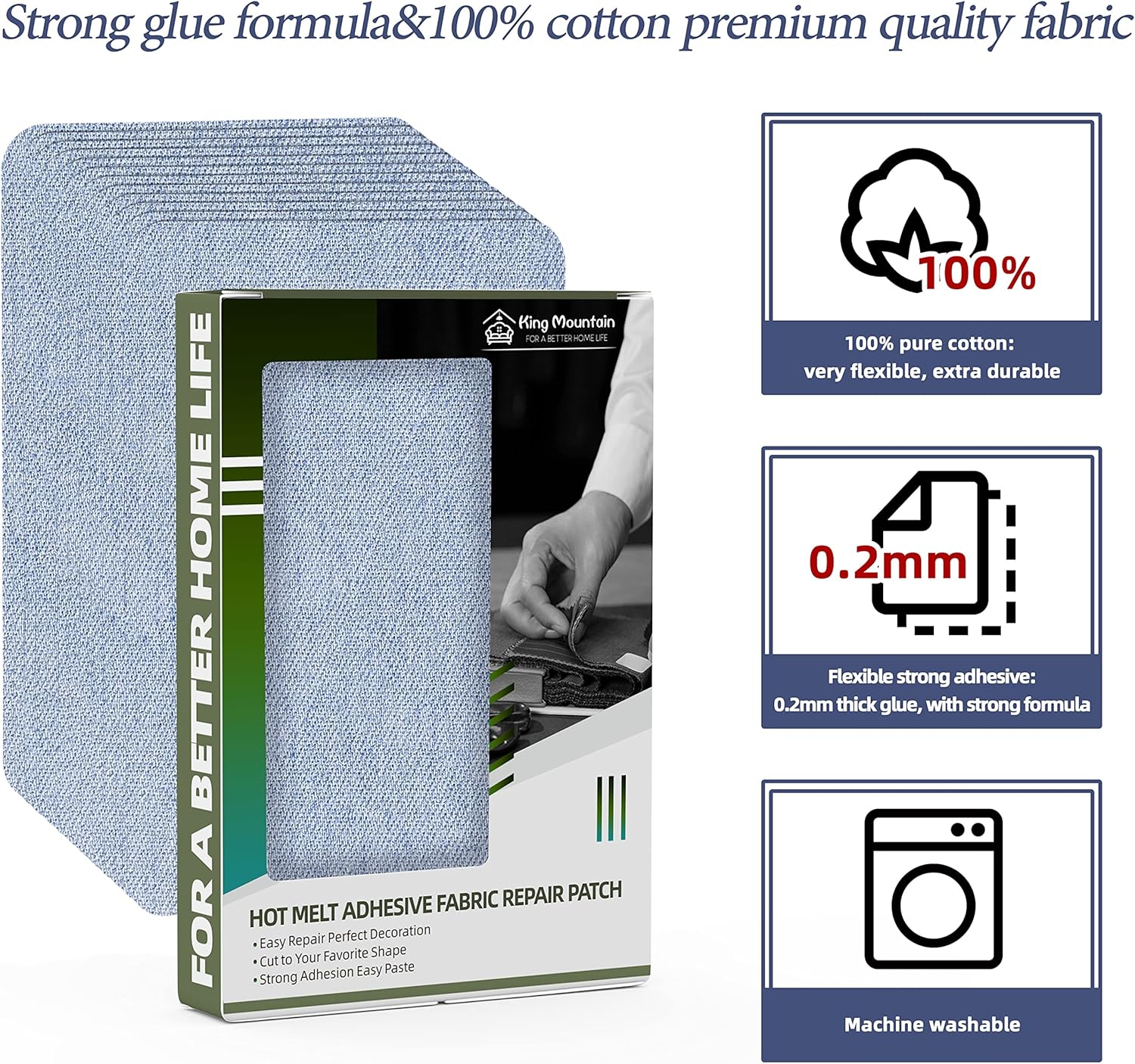 - Easier to Use: Our denim iron-on repair patches can repair or decorate your clothes in minutes, easy to apply in clothing repair, reinforcement, decoration. Open the package, remove the denim patch, stick it on the proper spot and iron at 330Β°F for one minute. (Can be used both inside and outside, no backing, no instructions for use)