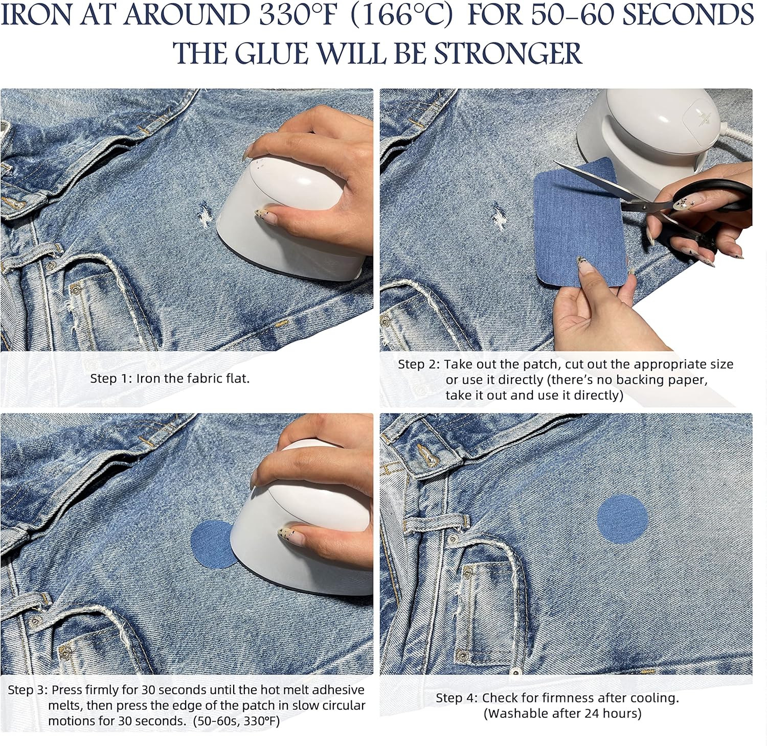 - Easier to Use: Our denim iron-on repair patches can repair or decorate your clothes in minutes, easy to apply in clothing repair, reinforcement, decoration. Open the package, remove the denim patch, stick it on the proper spot and iron at 330Β°F for one minute. (Can be used both inside and outside, no backing, no instructions for use)