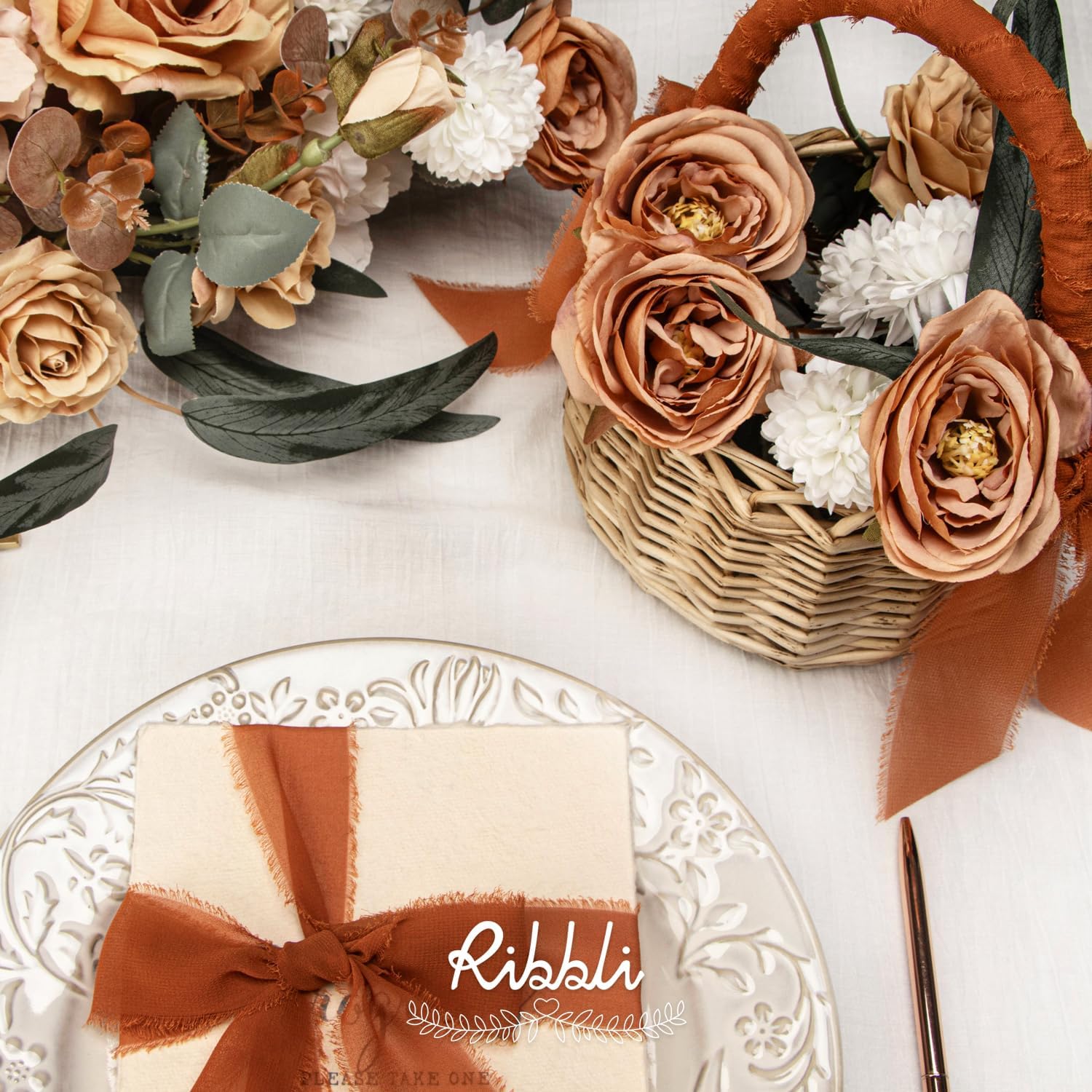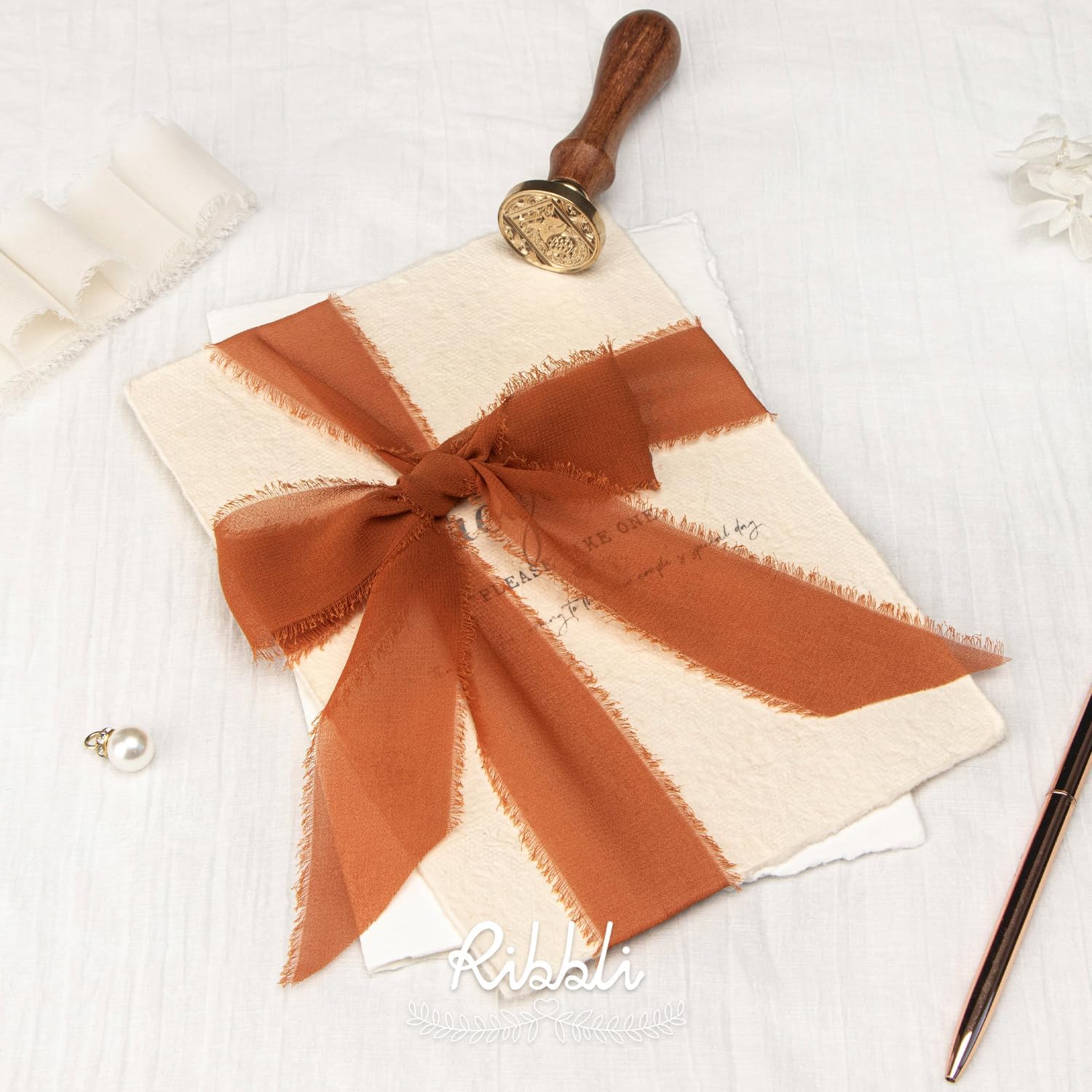 Ribbli Terracotta Chiffon Ribbon 1-1/2 inch x 20 Yard Handmade Fringe Chiffon Silk Ribbon,Black Ribbon for Wedding Invitations, Bridal Bouquets Wrapping, Flower Arrangement Decoration