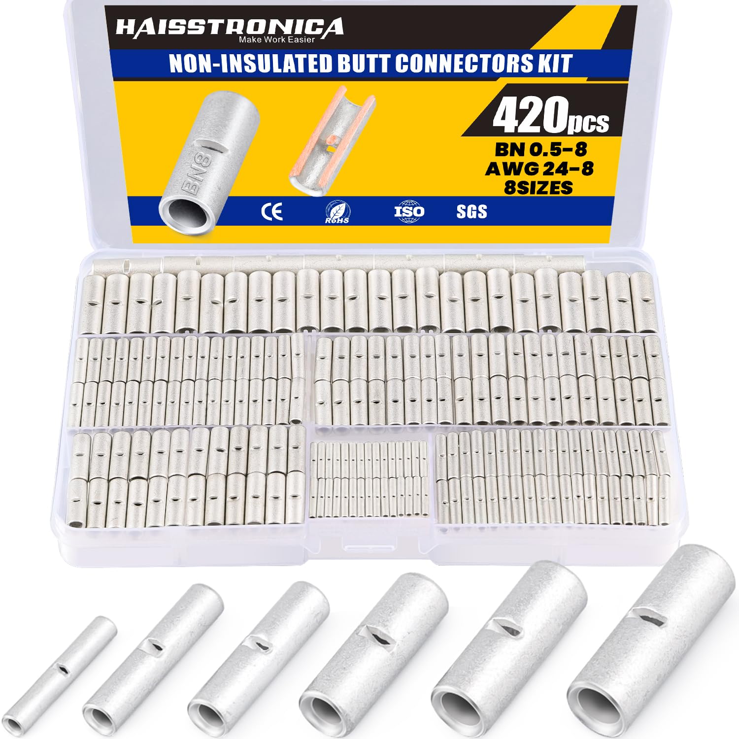 - Versatile Sizes:420pcs non-insulated butt connectors in a box,including 6 different sizes (AWG24-8),from small gauge wires to larger ones, these connectors can handle it all