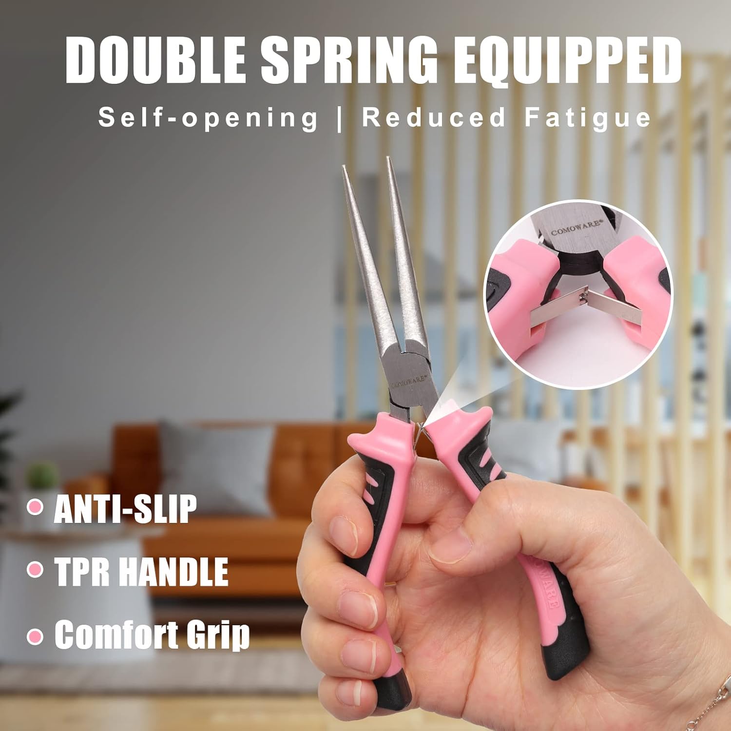 - ăSELF-OPENING SHRAPNEL DESIGNă These pink pliers are equipped with double spring shrapnel to keep the small pliers open automatically. And the leverage design saves you a lot of effort to hold and squeeze the handles. It is easy to work with two or three fingers to carry out precision work in hard-to-reach spaces.