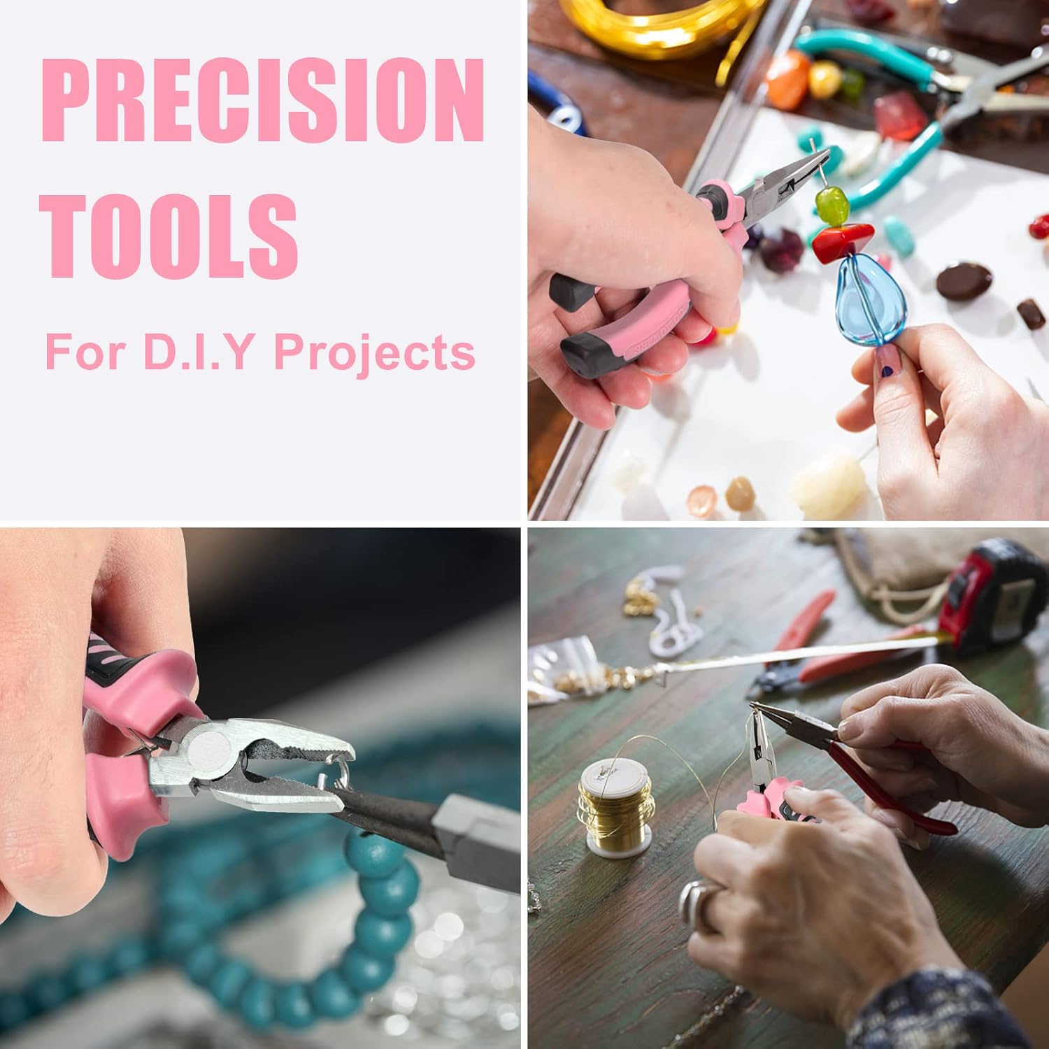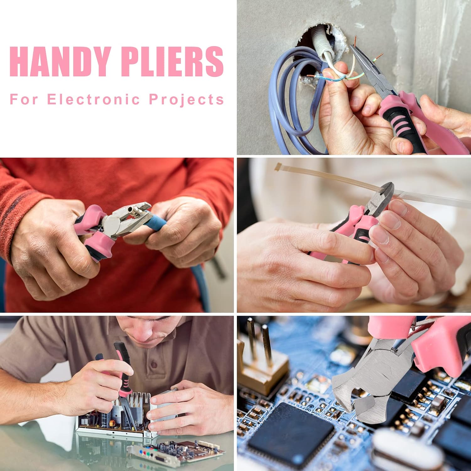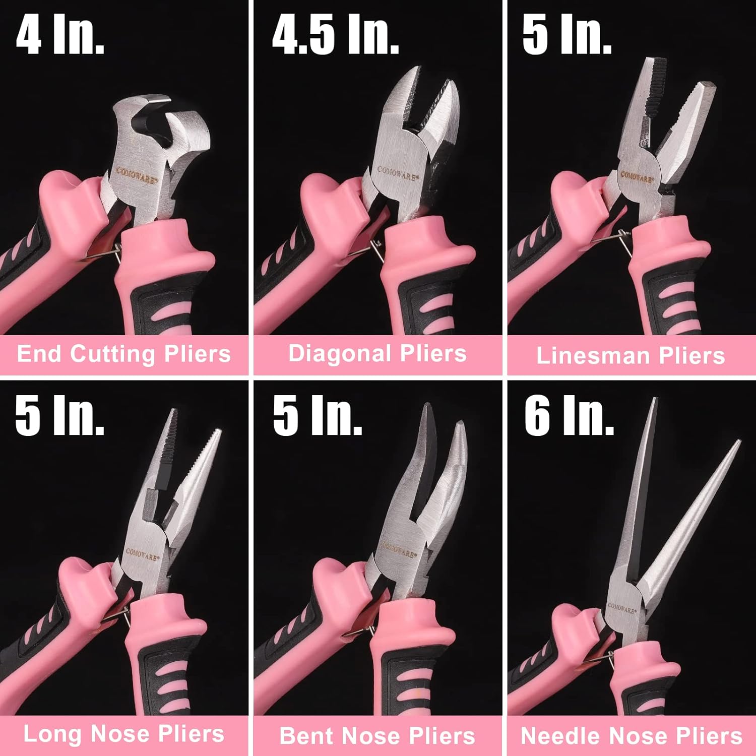 - ăMULTIPLE PLIERSă This mini pliers set includes 6-inch needle nose pliers, 5-inch linesman pliers, 5-inch mini long nose pliers, 5-inch mini bent nose pliers, 4.5-inch diagonal pliers and 4-inch end cutting pliers. The 6 piece pliers tool set helps to fix electronic tools and is suitable for crafts and jewelry making.