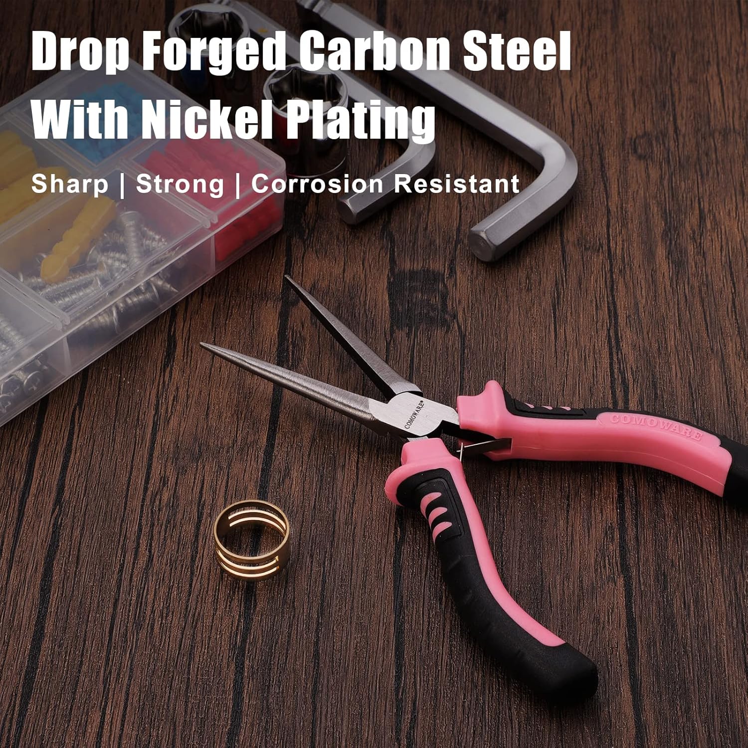 COMOWARE 6-Piece Mini Pliers Set, Needle Nose, Long Nose, Bent Nose, Diagonal, End Cutting and Linesman, for Crafts Work, Electronic Repair, with Pink Pouch