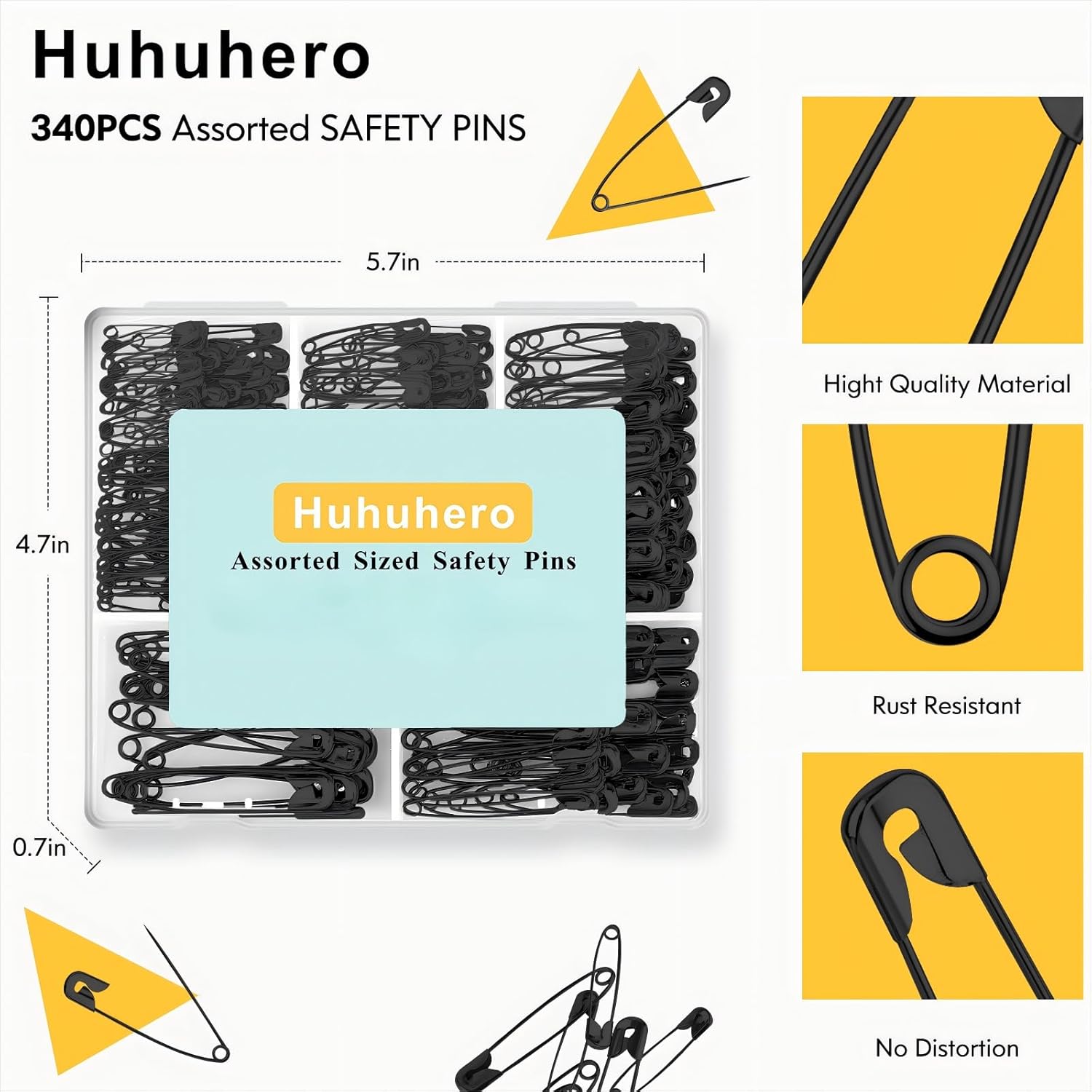 Safety Pins Assorted, 340 Pack Small & Large Heavy Duty Safety Pins for Clothes Sewing, 5 Different Sizes Pin Bulk, Arts and Crafts Supplies, Black