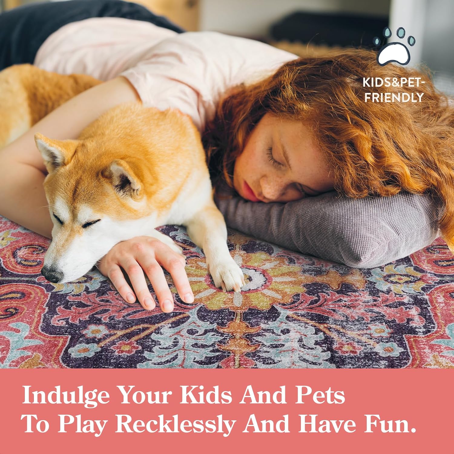 - [Exclusive Design Accent Rug] - This oriental area rug brings a vibrant color scheme and bohemian floral style print to your space. It mainly features a fuchsia, yellow stone, pretty light blue, pink ash brown design patterns, has a mystical quality that feels right out of a fairy tale, with purposeful distressing to add vintage appeal to your space.