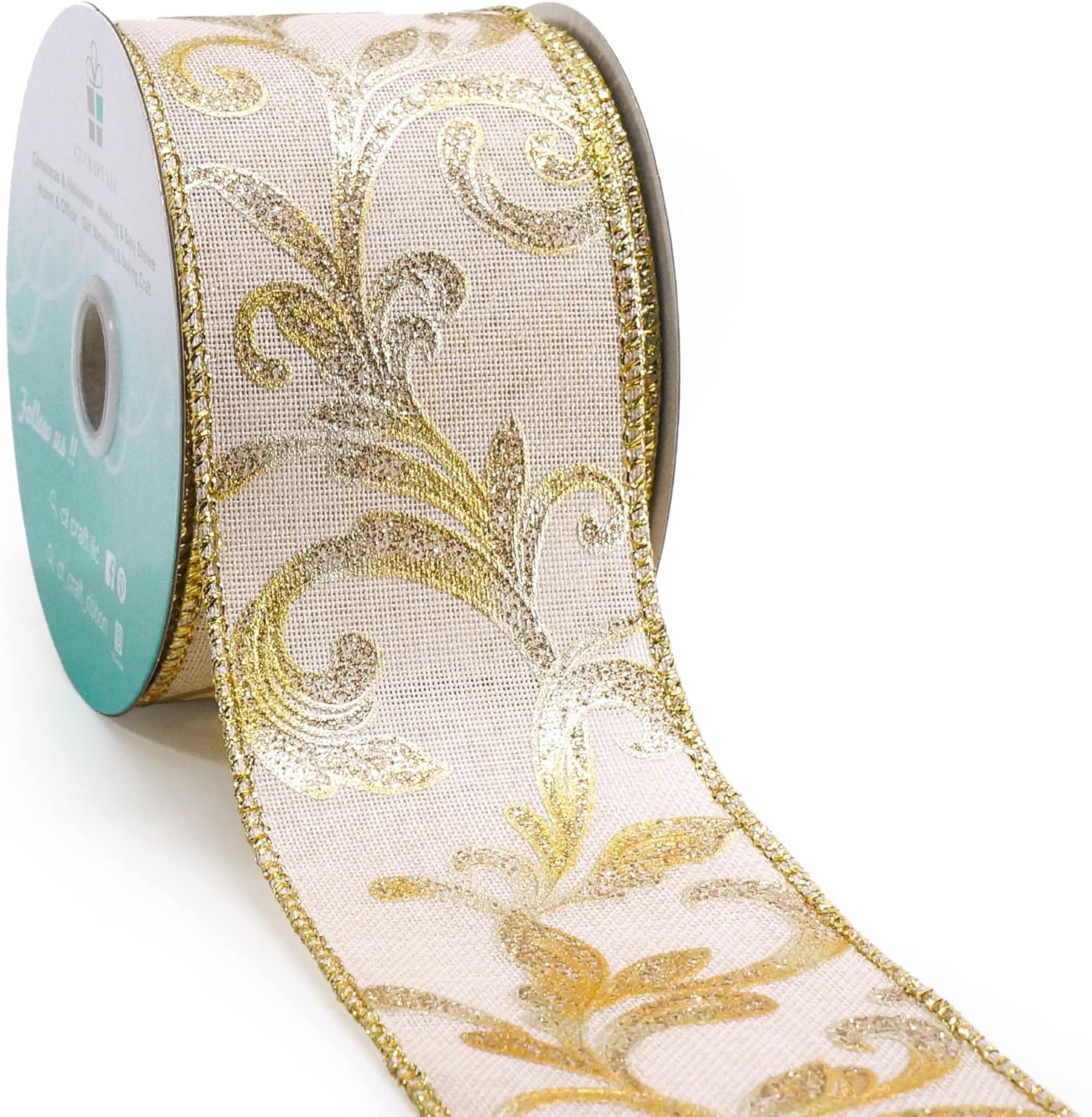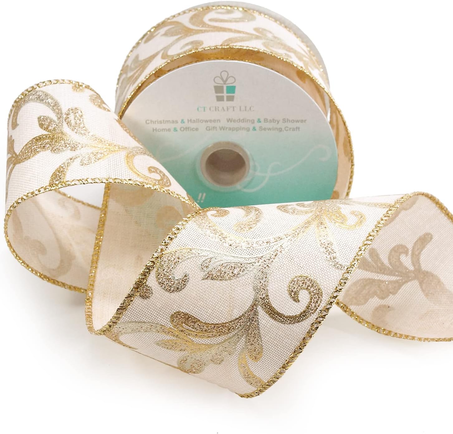 CT CRAFT LLC Tan Burlap Gold Swirl Wired Ribbon 2.5 Inch x 10 Yards for Christmas Home Decor Tree Topper Bow Gift Wrapping DIY Crafts Wreath Garland