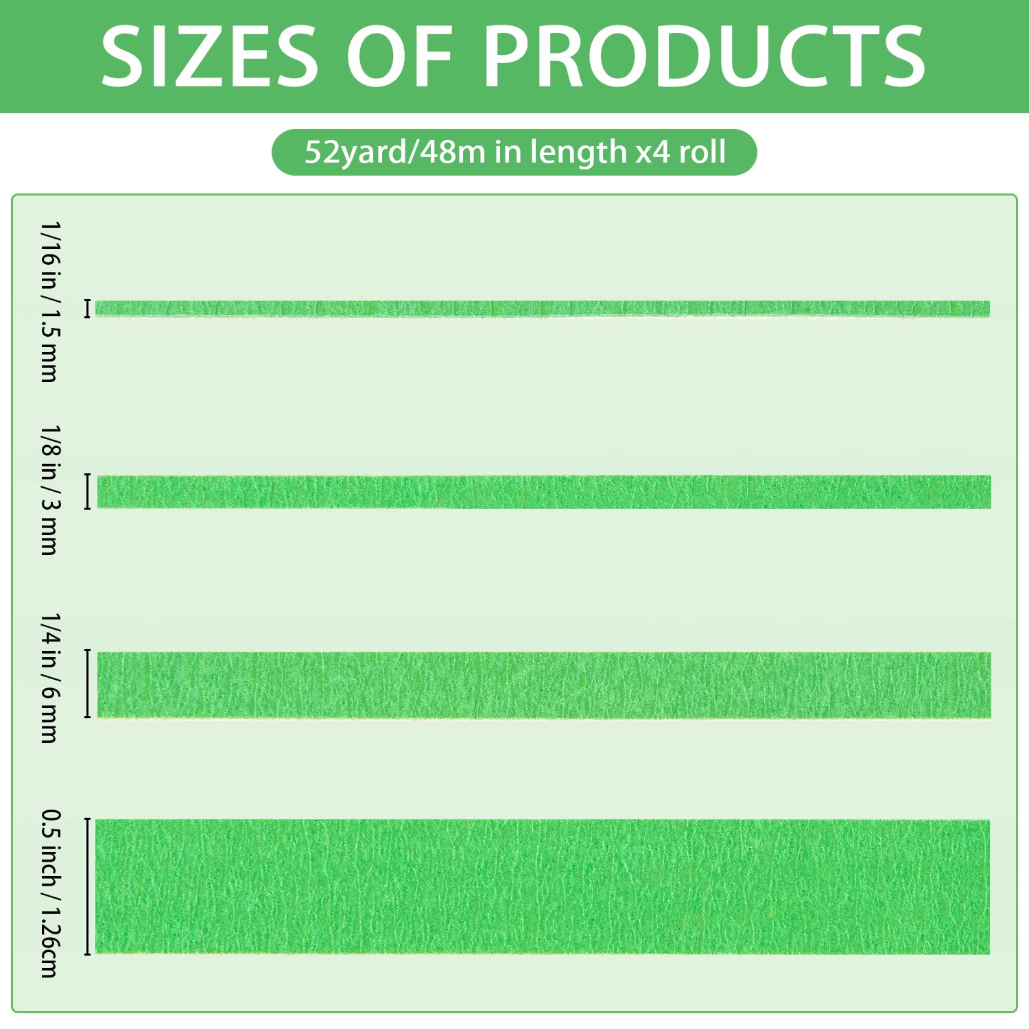 QDiShi 4 Rolls Fine Line Tape(Green), Fineline Masking Tape in 1/16, 1/8, 1/4 and 1/2 Inch Wide x 52 Yard Long, Automotive Masking Tape for DIY Car Auto Paint Art