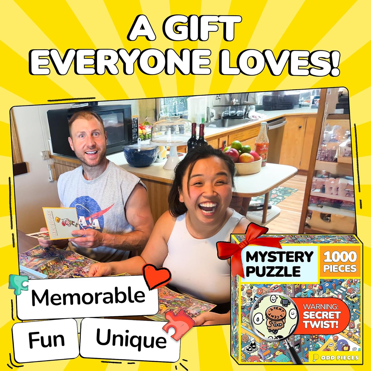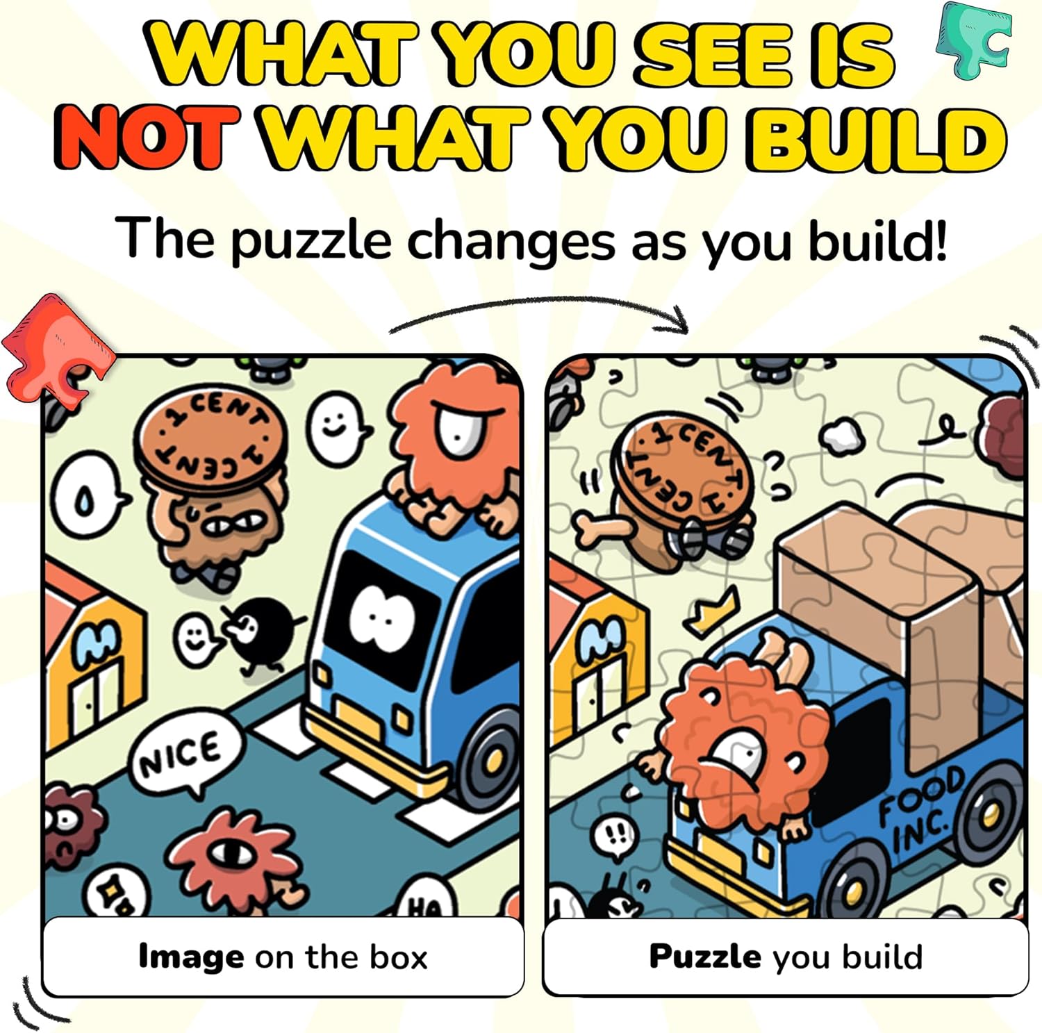 - Unique Jigsaw Puzzle with a Twist - The picture on the box isn’t the final scene! This 1000 piece mystery puzzle changes as you build, revealing hidden jokes and a surprise ending you won’t expect.