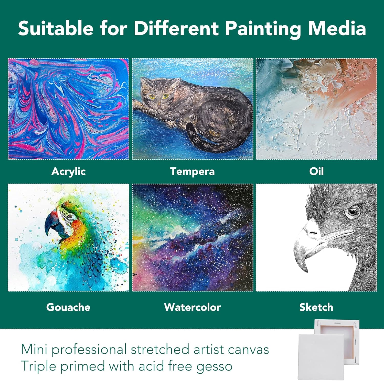 - 【STRETCHED CANVAS】: The 3x3 Stretched Canvas, perfect for oil paints, watercolor paints, acrylic paints, tempera and gouache.