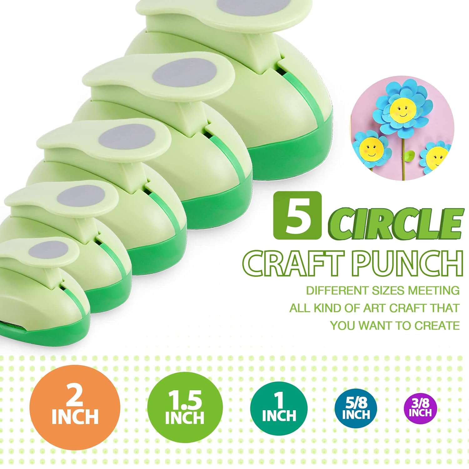 - 5 DIFFERENT SIZES CIRCLE PUNCH : Circle hole punch set comes with 5 different size - Multi-size shape hole punch combined packaging provides more possibilities and creativity. Including 3/8 inch circle punch, 5/8 inch circle punch, 1 inch hole punch, 1.5 inch hole punch, 2 inch hole punch. Creating circle shape for your DIY crafts, scrapbooks, photo album and more