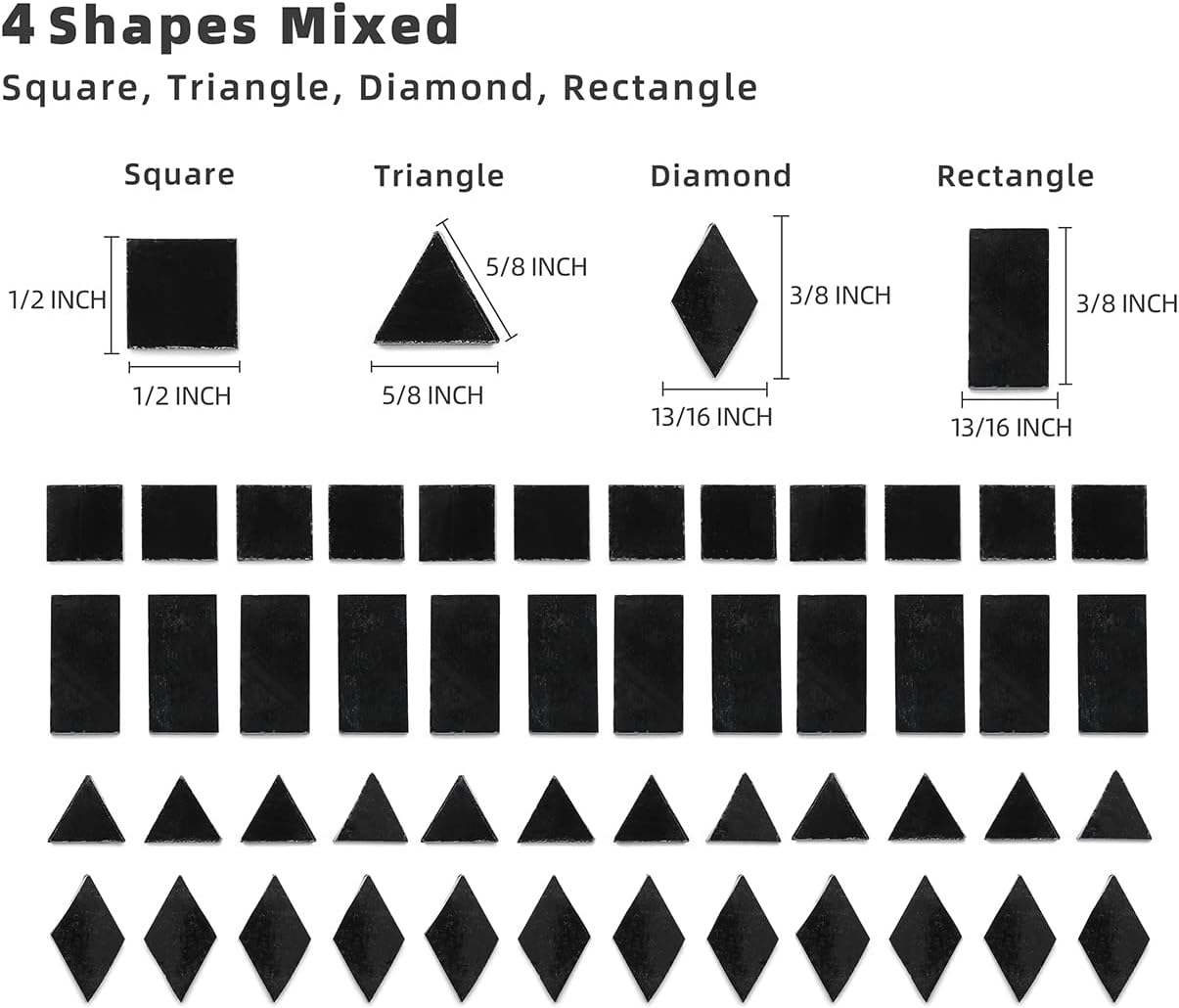 - 4 shapes mixed in each package - These mosaic pieces come with Square, Rectangle, Diamond and Triangle. Having all these precut beautiful shapes will not only save you a tremendous amount of time, but will also inspire you when trying to create new designs