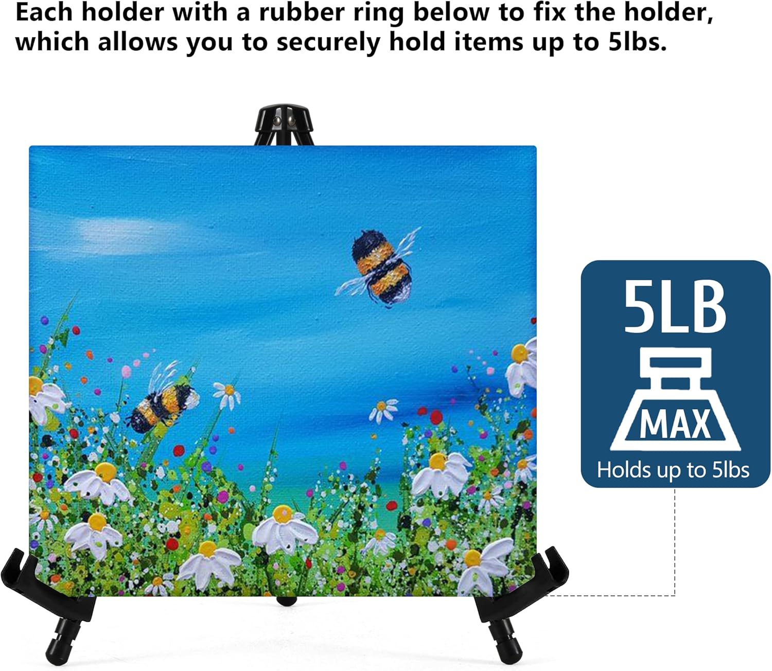 - Adjustable Holders: Two plastic clips on the legs can be slid up and down to adjust the height. Each holder with a rubber ring below to fix the holder, which allows you to securely hold items up to 5 lbs.