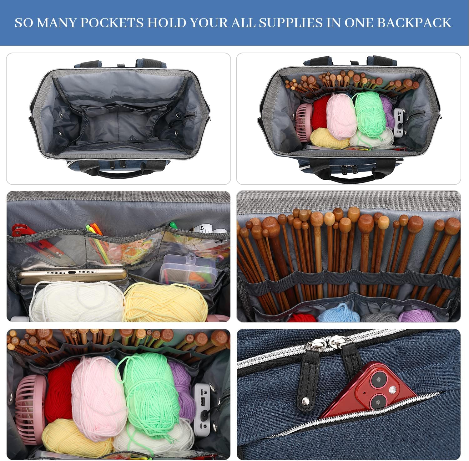 Crochet Backpack,Knitting Bag Backpack Yarn Storage Organizer Travel Crochet Bag with USB Charging Port,Large Yarn Tote Bag Yarn Holder Case for Knitting Needles,Crochet Hooks,Crochet Accessories,Blue