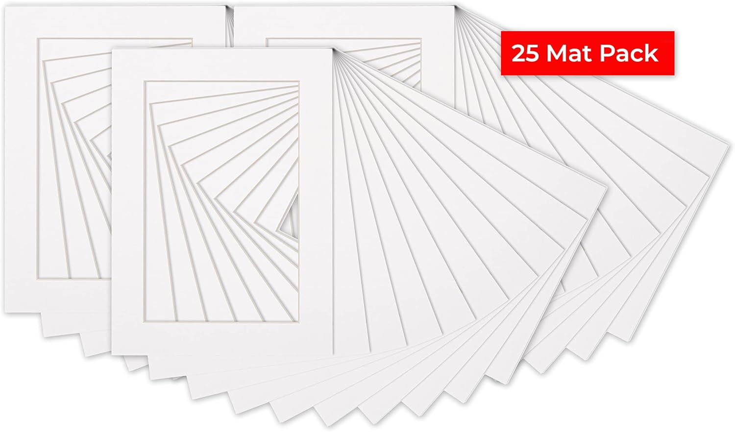 Pack of 25 Acid Free 8x10 Mats Bevel Cut for 5x8 Photos - White Precut Matboards with Backing Boards and Clear Photo Mat Bags for Pictures, Photos, Framing - 4-ply Thickness