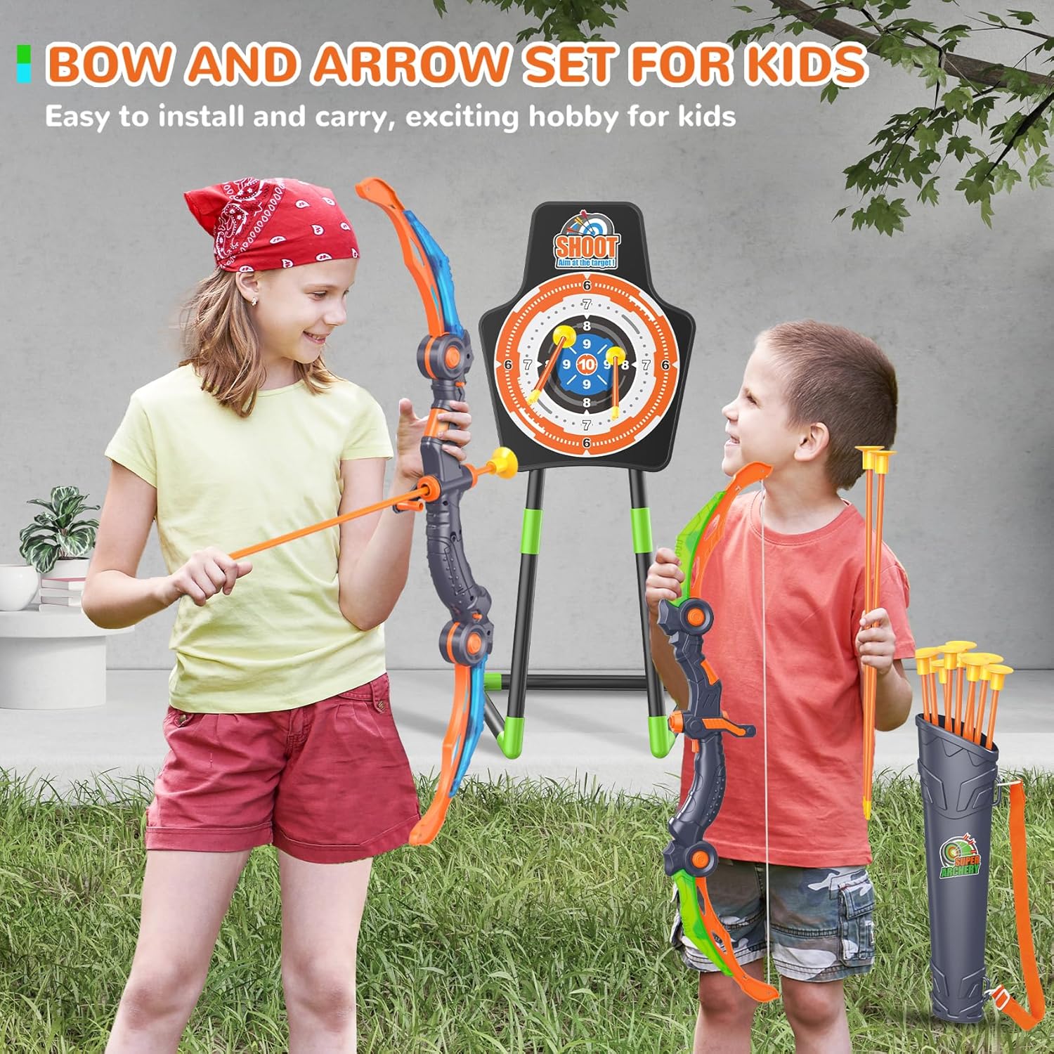 - Super Value Bow and Arrow Set: Our upgraded Bow and Arrow toy set is compatible with 2 play modes. Included 2 collapsible bow with LED lights, 20 suction cup arrows, 2 adjustable shoulder strap quiver, 20 foam darts (10 blue & 10 green) and 1 standing practice target. A perfect indoor or outdoor game suitable for boy toys 5, 6, 7, 8, 9, 10, 11, 12 years old. Arrows come with a suction-cup head that safely sticks to targets.