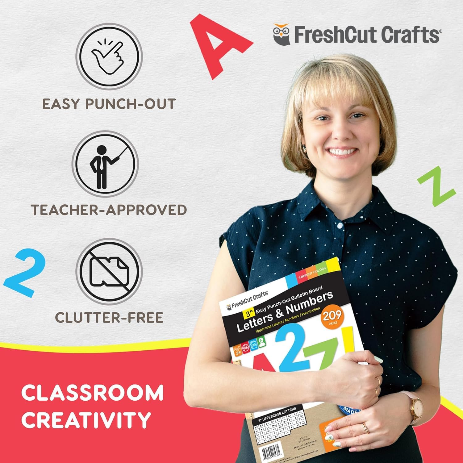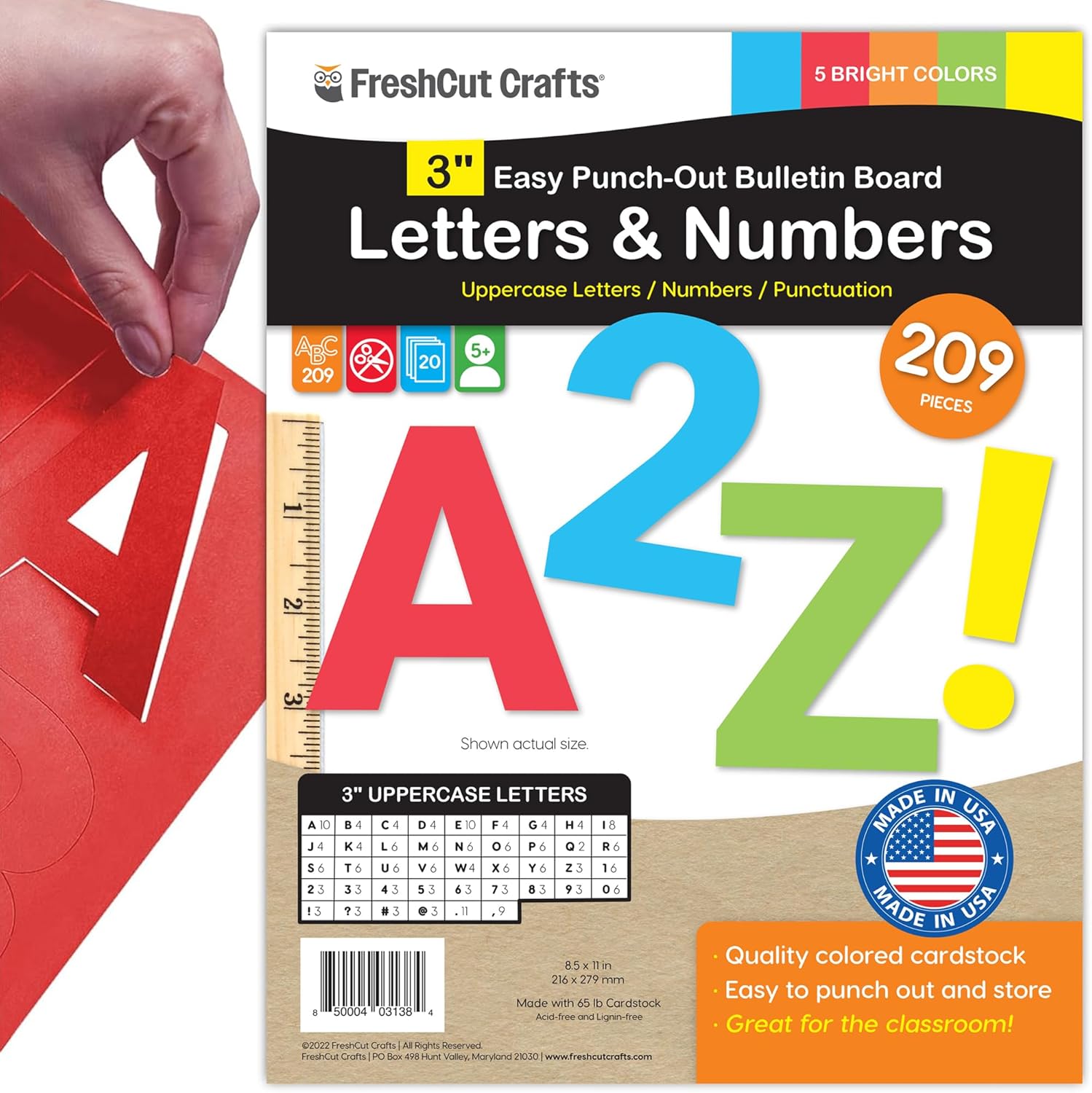209 Pcs 3" Bright Bulletin Board Letters & Numbers, Capital, Numbers, Punctuation, US Made Card Stock Punch Out Letters for Poster, Bulletin Board, Classroom - Precut