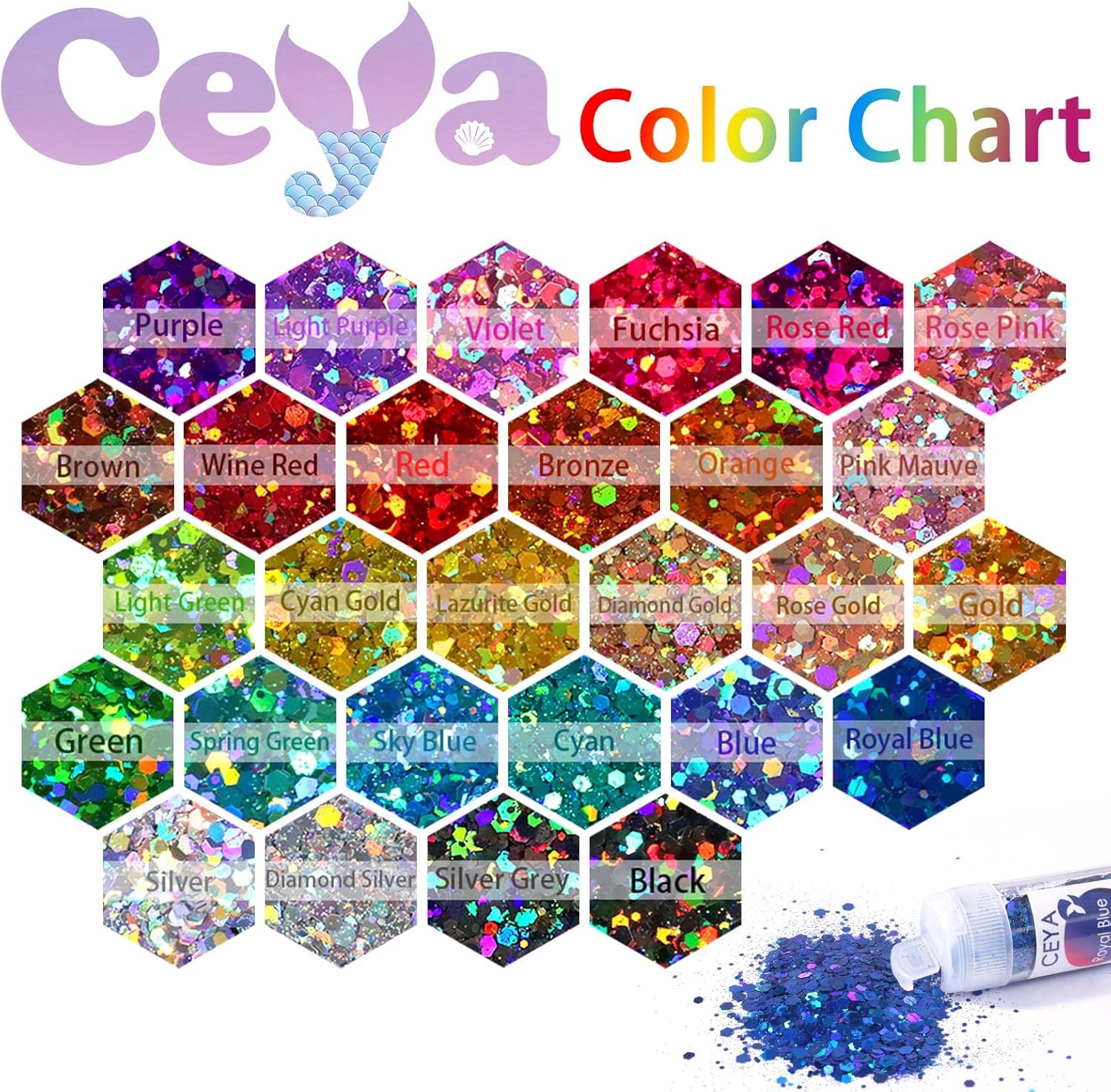 - π Mini Convenient Design: With the unique bottle cap design, the double opening and different powder pouring methods allow you to easily control the flow and usage of the glitters. Each with an exquisite color label and all items are packed nicely in a strong box.